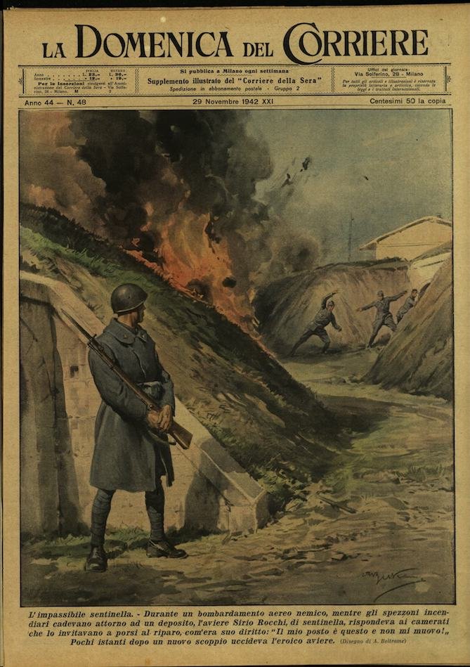 In-4, brossura, in buono stato di conservazione. In questo numero:"Matrimonio sotto il mare. - A bordo di un grande sommergibile oceanico tedesco in navigazione di guerra si svolge - a 60 metri sott'acqua - una commovente scena, il matrimonio per procura di un marinaio. Il comandante, i testimoni e gli amici, riuniti davanti alla radio di bordo ascoltano, con lo sposo, il si della sposa lontana.""L'impassibile sentinella. - Durante un bombardamento aereo nemico, mentre gli spezzoni incendiari cadevano attorno ad un deposito, l'aviere Sirio Rocchi, di sentinella, rispondeva ai camerati che lo invitavano a porsi al riparo, com'era suo diritto, Il mio posto è questo e non mi muovo! Pochi istanti dopo un nuovo scoppio uccideva l'eroico aviere.".