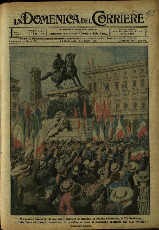 In-4, brossura, in buono stato di conservazione. In questo numero:"Il solenne giuramento di migliaia e migliaia di Milanesi in Piazza del Duomo, il XX Settembre. .Giuriamo ai fratelli combattenti di resistere a costo qualunque sacrificio fino alla vittoria!""Il Re Del Bottino. Un grande cannone tedesco da 280 conquistato intatto dagli australiani, è stato trasportato a Parigi per ordine di Clemenceau, magnifica testimonianza della vittoria degli Alleati.".