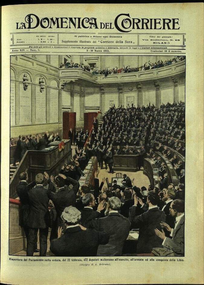 In-4, brossura, in buono stato di conservazione. In questo numero:"Riapertura del Parlamento, nella seduta, del 22 febbraio, 472 deputati acclamano all'esercito, all'armata ed alla conquista della Libia.""La prima impresa guerresca degli Ascari in Tripolitania.. a Zanzur".