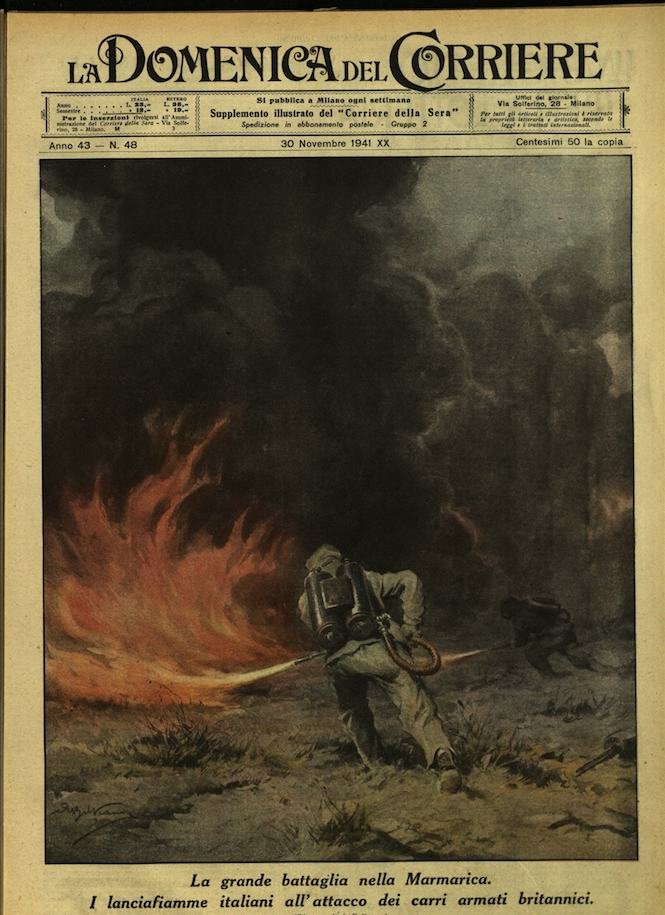 In-4, brossura, in buono stato di conservazione. In questo numero:"Tempesta di fuoco. Squadre di aeroplani dell'Asse piombano in picchiata sulle colonne motorizzate inglesi che attaccano nella Marmarica e le tempestano di bombe fracassando molti carri e inchiodandone altri al terreno.""La grande battaglia nella Marmarica. I lanciafiamme italiani all'attacco dei carri armati britannici.".
