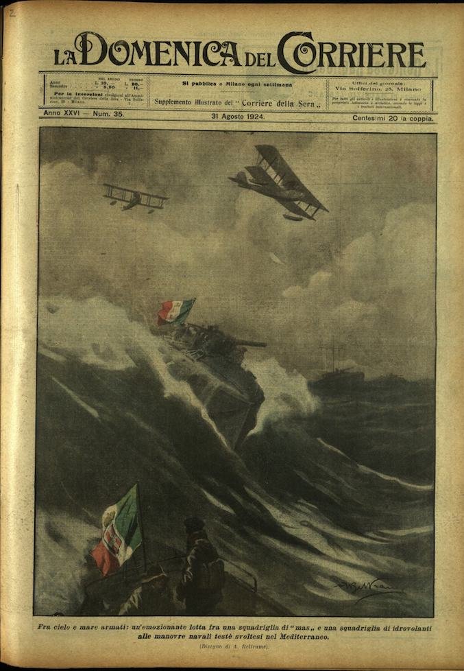 In-4, brossura, in buono stato di conservazione. In questo numero:"Fra cielo e mare armati, un'emozionante lotta fra una squadriglia di mas e una squadriglia di idrovolanti alle manovre navali teste svoltesi nel Mediterraneo.""Una partita di pugilato senza precedenti, A Washington, Battling Tony cavallo campione dei pesi leggeri del Terzo Corpo d'Armata, mentre si rialza dopo un a corpo a corpo coll'avversario, il dott Alberto Walker, veterinario militare.".