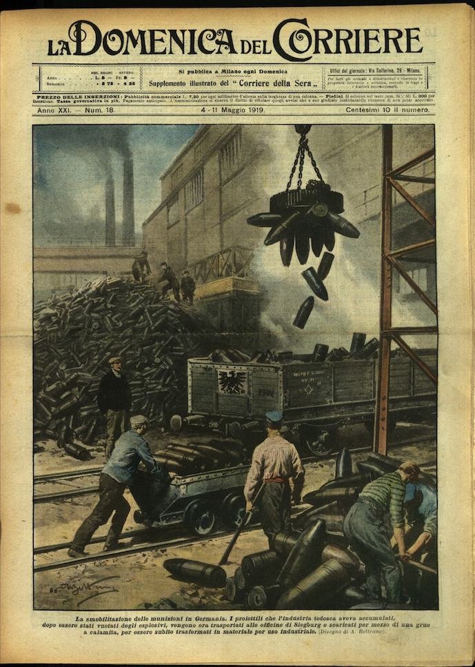 In-4, brossura, in buono stato di conservazione. In questo numero:"Le applicazioni impensate dell'aviazione, il servizio viveri per le vie dell'aria, in Mesopotamia. Un aviatore inglese passa su Fallujeh, in riva all'Eufrate, con una strana coda all'apparecchio, il pollame che ha comperato per la mensa della sua squadriglia.""La smobilitazione delle munizioni in Germania. I proiettili che l'industria tedesca aveva accumulati, dopo essere stati vuotati degli esplosivi, vengono ora trasportati alle officine di Siegburg e scaricati per mezzo di una grue a calamita, per essere subito trasformati in materiale per uso industriale.".
