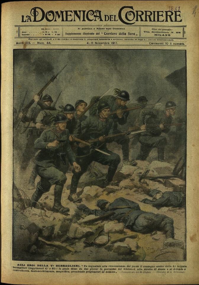 In-4, brossura, in buono stato di conservazione. In questo numero:"Nei giorni della lotta. Il febbrile movimento nelle retrovie.""Agli Eroi Della Va Bersaglieri. Va segnalato alla riconoscenza del paese il contegno eroico della 5a brigata bersaglieri (reggimenti 4° e 21°) la quale tiene da due giorni la posizione del Globocak alla stretta di Auzza e si difende e contrattacca, instancabilmente, magnifica, prendendo prigionieri al nemico.".