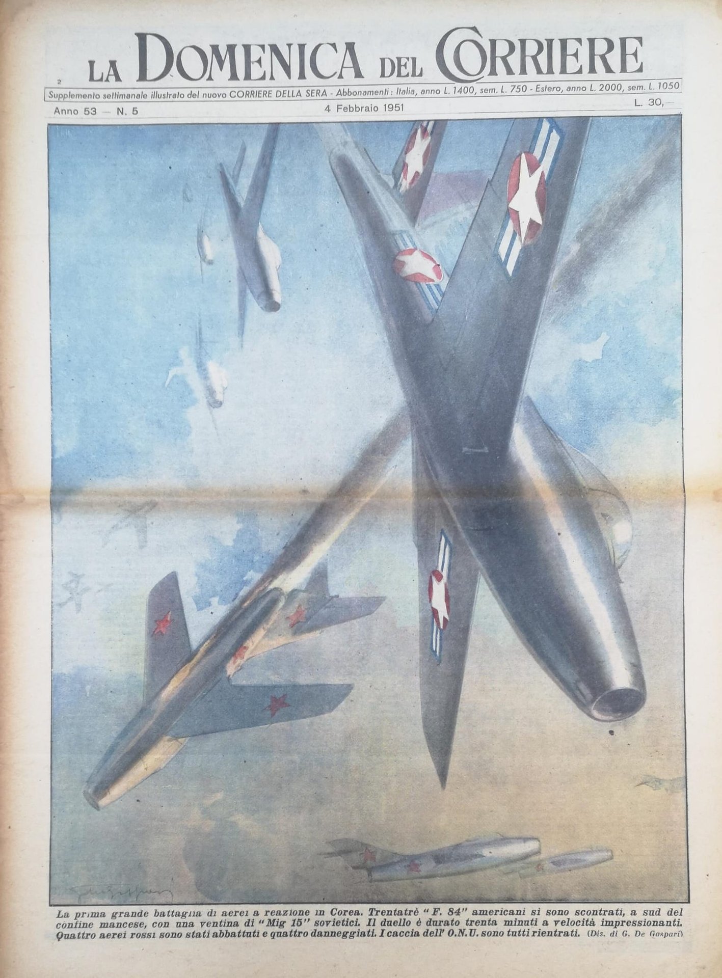 In-4, brossura, in buono stato di conservazione. In questo numero:"La morte bianca sulle Alpi. Grandi nevicate seguite da scirocco hanno provocato in tutte le valli italiane, svizzere e austriache una quantità di disastrose valanghe con un bilancio di oltre 300 morti. A Rio Bianco in Valle Aurina una immensa massa di neve ha distrutto la casa di un montanaro, uccidendo sua moglie e i quattro figli.""La prima grande battaglia di aerei a reazione in Corea. Trentatre F 84 americani si sono scontrati, a sud del confine mancese, con una ventina di Mig 15 sovietici. Il duello è durato trenta minuti a velocità impressionanti. Quattro aerei rossi sono stati abbattuti e quattro danneggiati. I caccia dell'ONU sono tutti rientrati.".