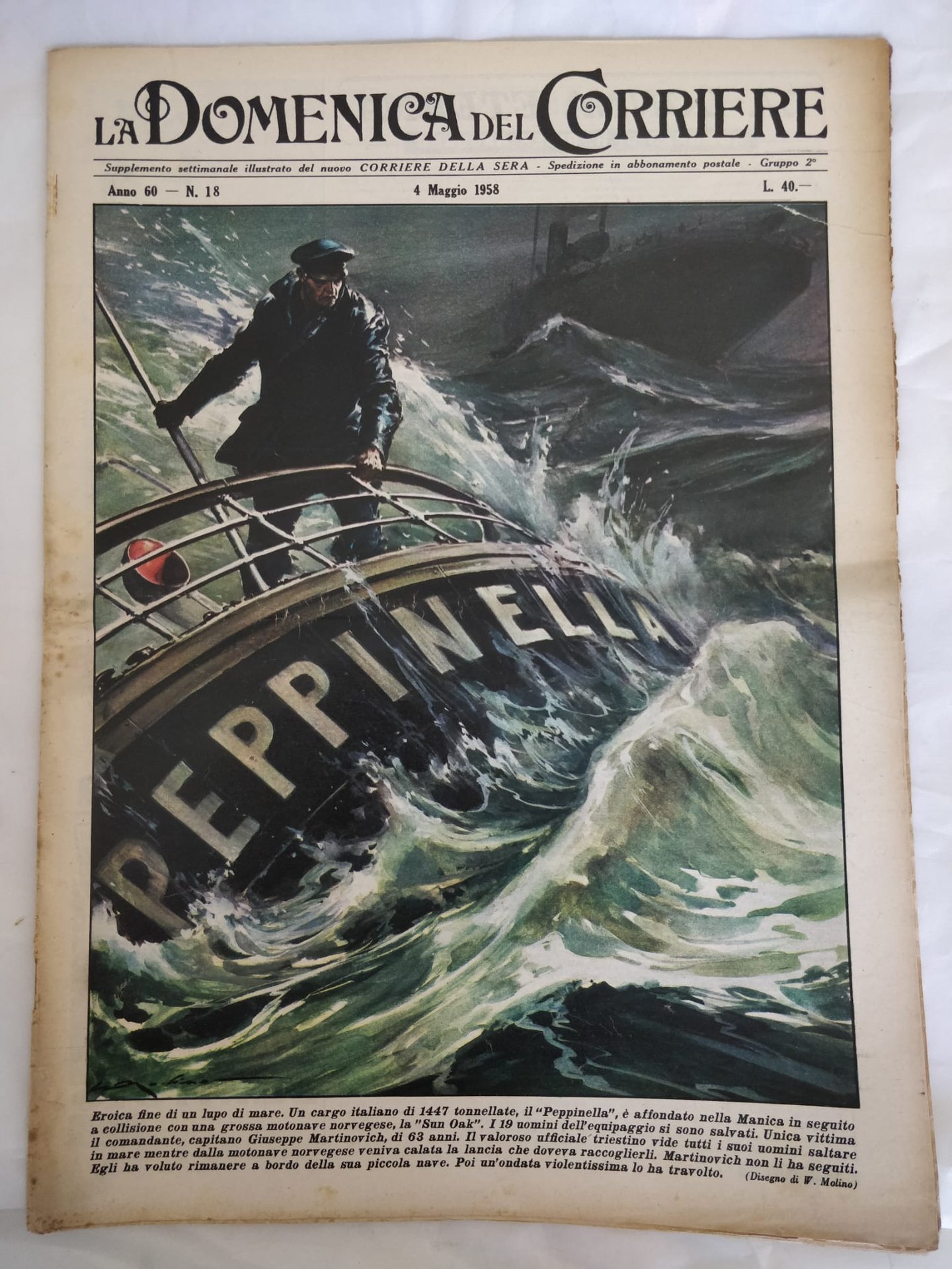 In-4, brossura, in buono stato di conservazione. In questo numero:"Chirurgia subacquea. All'Aquarium di Miami, in Florida, due veterinari, calatisi con la maschera dell'ossigeno in fondo a una vasca, hanno compiuto un'operazione senza precedenti. Il paziente era un pesce giudeo, uno di quei mostruosi e giganteschi esseri appartenenti alla famiglia del serranidi. L'intervento chirurgico si era reso necessario per estrarre dal corpo del pesce un oggetto ingombrante che l'animale aveva inghiottito qualche tempo prima.""Eroica fine di un lupo di mare. Un cargo italiano di 1447 tonnellate, il Peppinella, è affondato nella Manica in seguito a collisione con una grossa motonave norvegese, la Sun Oak. I 19 uomini dell'equipaggio si sono salvati. Unica vittima il comandante, capitano Giuseppe Martinovich, di 63 anni. Il valoroso ufficiale triestino vide tutti i suoi uomini saltare in mare mentre dalla motonave norvegese veniva calata la lancia che doveva raccoglierli. Martinovich non li ha seguiti. Egli ha voluto rimanere a bordo della sua piccola nave. Poi un'ondata violentissima lo ha travolto.".