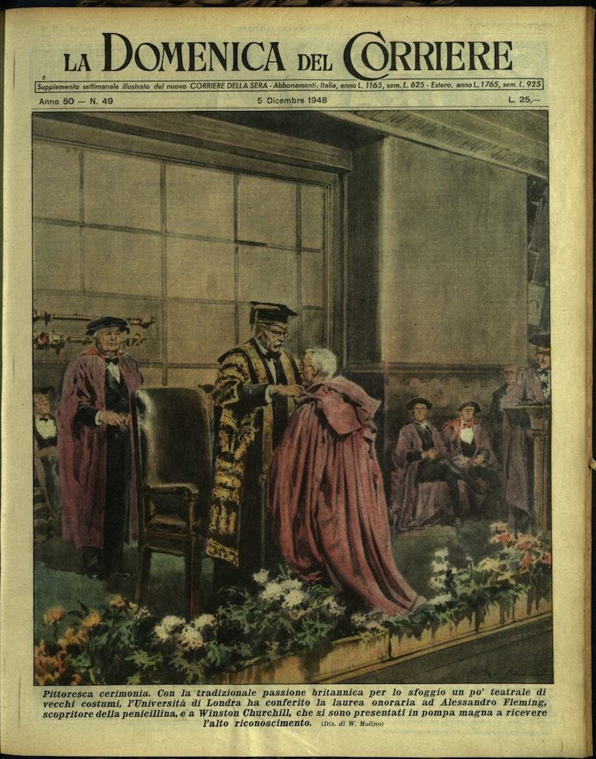 In-4, brossura, in buono stato di conservazione. In questo numero:"Continua la tragedia degli emigranti. Ingannati da loschi impresari che organizzano il passaggio clandestino della frontiera, alcuni emigranti che tentavano di raggiungere la Francia sopra una barca hanno fatto naufragio al largo di Ventimiglia. Soltanto l'intervento di due motoscafi delle polizie italiana e francese ha evitato una più grave sciagura.""Pittoresca cerimonia. Con la tradizionale passione britannica per lo sfoggio un po' teatrale di vecchi costumi, l'Universita di Londra ha conferito la laurea onoraria ad Alessandro Fleming, scopritore della penicillina, e a Winston Churchill, che si sono presentati in pompa magna a ricevere l'alto riconoscimento.".