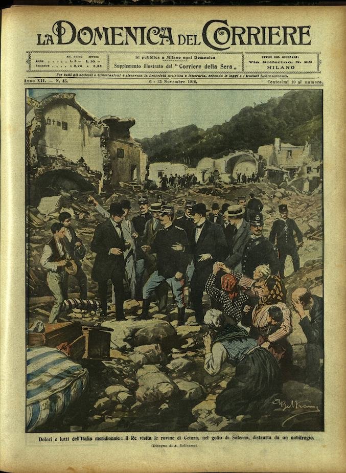 In-4, brossura, in buono stato di conservazione. In questo numero:"Tragico destino d'una madre, salva da un incendio due bimbi morti bruciati credendoli ancora vivi.""Dolori e lutti dell'Italia meridionale, il Re visita le rovine di Cetara, nel golfo di Salerno, distrutta da un nubifragio.".