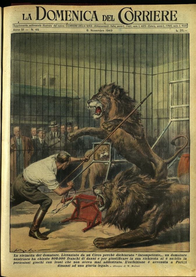 In-4, brossura, in buono stato di conservazione. In questo numero:"La rivincita del domatore. Licenziato da un Circo perchè dichiarato incompetente, un domatore austriaco ha chiesto 800.000 franchi di danni e per giustificare la sua richiesta si è esibito in pericolosi giochi con leoni che non aveva mai addestrato. L'esibizione e avvenuta a Parigi dinanzi ad una giuria legale.""Una pazza in chiesa. Nella parrocchiale di Castelluccio Valmaggiore (Foggia) una squilibrata aggrediva il sacerdote intento a distribuire le ostie e gli strappava di mano la pisside, fra lo sgomento dei fedeli.".