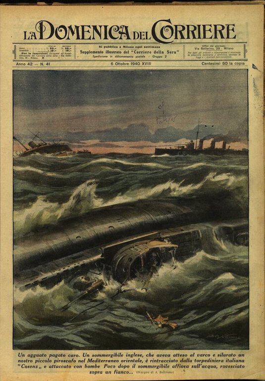 In-4, brossura, in buono stato di conservazione. In questo numero:"Una vana incursione inglese nella zona di Cassala occupata dalle truppe italiane. Sorpresi da pattuglie indigene guidate da valorosi ufficiali nostri, i britannici sono battuti e costretti alla fuga.""Un agguato pagato caro. Un sommergibile inglese, che aveva atteso al varco e silurato un nostro piccolo piroscafo nel Mediterraneo orientale, e rintracciato dalla torpediniera italiana Cosenz è attaccato con bombe. Poco dopo il sommergibile affiora sull'acqua, rovesciato sopra un fianco..".