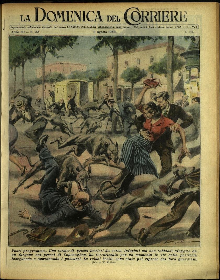 In-4, brossura, in buono stato di conservazione. In questo numero:"Gelosia ad alta tensione. In un istituto di bellezza a Parigi una giovane sorprende tra le clienti la rivale e, avventandosele contro, la acconcia a modo suo..""Fuori programma.. Una torma di grossi levrieri da corsa, infuriati ma non rabbiosi, sfuggita da un furgone nei pressi di Copenaghen, ha terrorizzato per un momento le vie della periferia inseguendo e azzannando i passanti. Le veloci bestie sono state poi riprese dai loro guardiani.".