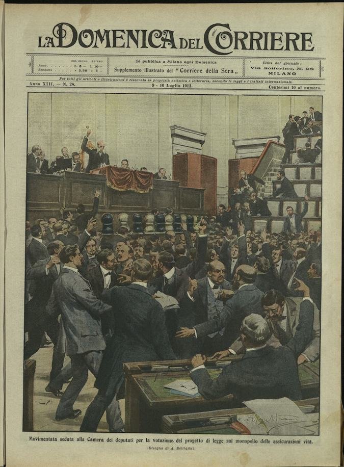 In-4, brossura, in buono stato di conservazione. In questo numero:"Movimentata seduta alla Camera dei deputati per la votazione del progetto di legge sul monopolio delle assicurazioni vita.""Sul ponte monumentale nel pomeriggio di domenica scorsa all'Esposizione di Torino, che fu visitata da quasi 100,000 persone.".