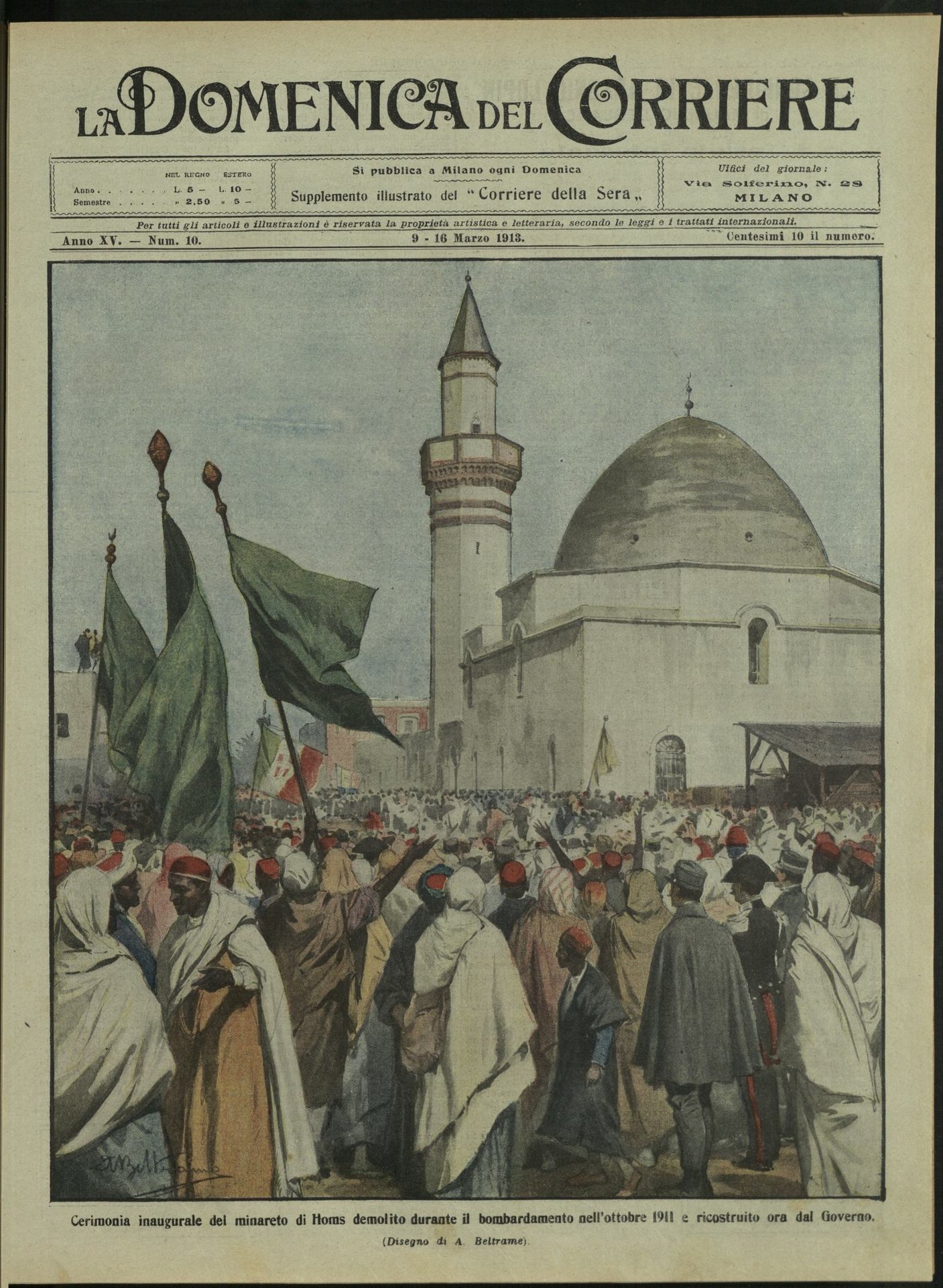 In-4, brossura, in buono stato di conservazione. In questo numero:"Soldato imprudente salvato dalla prontezza di spirito d'una casellante della linea ferroviaria Milano-Domodossola.""Cerimonia inaugurale del minareto di Homs demolito durante il bombardamento nell'ottobre 1911 e ricostruito ora dal Governo.".