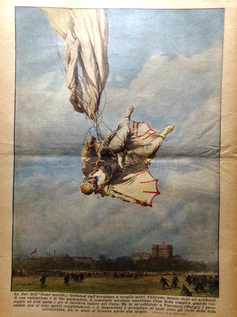 La fine dell'uomo uccello. Il temerario acrobata americano Clem Sohn gettatosi da 3 mila metri d'altezza è morto durante un'esibizione a Vincennes (Parigi) (Achille Beltrame)