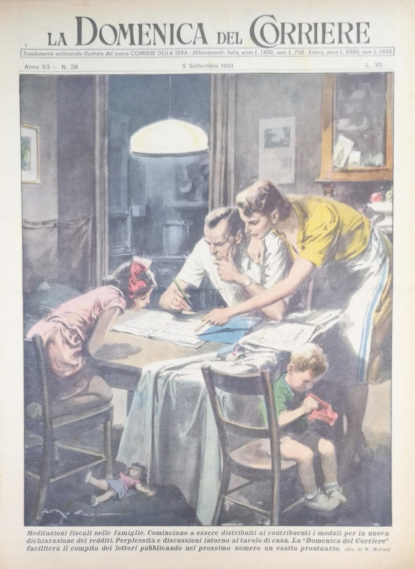 In-4, brossura, in buono stato di conservazione. In questo numero:"Giovanotto a 83 anni. Per dimostrare che si puo essere in gamba anche a questa tarda eta un certo Bernard Mac Fadden, si è lanciato in paracadute da un aereo nel fiume Hudson, nello Stato di Nuova York, dopo essersi fatto precedere, a titolo precauzionale, da un fantoccio, pure paracadutato. Sceso in acqua felicemente, ha messo in opera il salvagente pneumatico e a chi è venuto a ripescarlo ha detto, Mi sento davvero come un ragazzino!.""Meditazioni fiscali nelle famiglie. Cominciano a essere distribuiti ai contribuenti i moduli per la nuova dichiarazione dei redditi. Perplessita e discussioni intorno al tavolo di casa. La Domenica del Corriere facilitera il compito dei lettori pubblicando nel prossimo numero un esatto prontuario.".