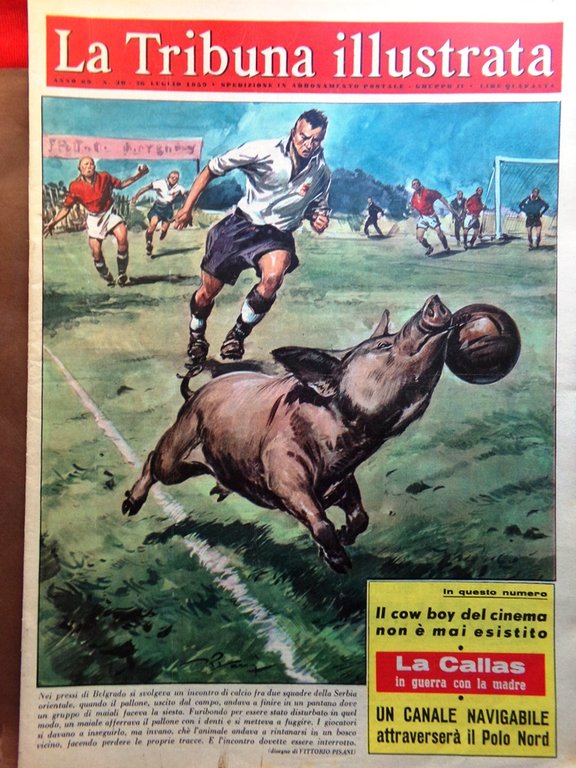 Nei pressi di Belgrado si svolgeva un incontro di calcio fra due squadre della Serbia orientale, quando il pallone, uscito dal campo, andava a finire in un pantano dove un gruppo di maiali faceva la siesta. Furibondo per essere stato disturbato in quel modo, un maiale afferrava il pallone con i denti e si metteva a fuggire. I giocatori si davano a inseguirlo, ma invano, ché l'animale andava a rintanarsi in un bosco vicino, facendo perdere le proprie tracce. E l'incontro dovette essere interrotto (disegno di Vittorio Pisani)
