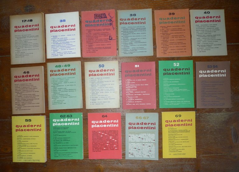 [Lotto di 17 numeri]QUADERNI PIACENTINIBimestrale diretto da Piergiorgio Bellocchio (responsabile),Grazia Cherchi, Goffredo Fofi e altriAnno III n.17-18, luglio-sett. 1964, pp.72Anno VII n.35, luglio 1968, pp.147Anno VII n.36, novembre 1968, pp.159Anno VIII n.38, luglio 1969, pp.229Anno VIII n.39, novembre 1969, pp.227Anno IX n.40, aprile 1970, pp.198Anno XI n.46, marzo 1972, pp.206Anno XII n.48-49, gennaio 1973, pp.223Anno XII n.50, luglio 1973, pp.210Anno XII n.51, gennaio 1974, pp.173Anno XIII n.52, giugno 1974, pp.208Anno XIII n.53-54, dicembre 1974, pp.248Anno XIV n.55, maggio 1975, pp.168Anno XVI n.62-63, aprile 1977, pp.222Anno XVI n.64, luglio 1977, pp.173Anno XVII n.67-68, giugno 1978, pp.185Anno XVII n.69, dicembre 1978, pp.156brossura, 22x15,5 cm.,peso: kg.4cod.10153CONDIZIONI DELLE RIVISTE: buone,imperfezioni a qualche copertina,pagine ingiallite,n.36: scritte e scarabocchi in copertina,firma nella pagina del sommario,poche sottolineature a pennan.51: abrasioni con mancanze all'ultima di copertinae alle ultime pagine, il testo è minimamente coinvolton.52: abrasione al dorso