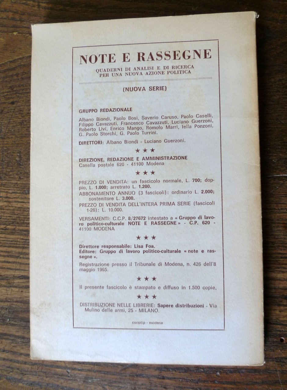 NOTE E RASSEGNE (Nuova serie)n.1-2 Gennaio-Agosto 1973.Anno decimo 37-38.Quaderni di analisi e di ricerca per una nuova azione politica.Quadrimestrale.Direttori: Albano Biondi, Luciano Guerzoni.Fascicolo doppio dedicato a:"CETI MEDI", BUROCRAZIA, RIVENDICAZIONI OPERAIE:materiali per il dibattito sulla strategiadel movimento operaio italiano.Modena 1973,brossura, 21x14 cm., pp.156,peso: g.250cod.10193CONDIZIONI DELLA RIVISTA: buone,copertina e pagine ingiallite,timbro di appartenenza alla prima pagina