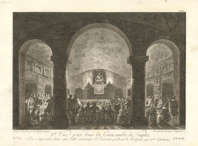 1 .ere Vue prise dan les Catacombes de Naples. L'on a representé dans cette Salle souterraine S.t Janvier préchant la Religion aux l.ere Chrétiens