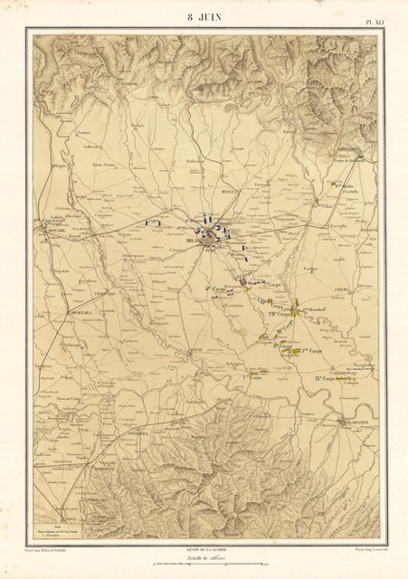 Carta geografica stampata su fondo seppia con evidenziati a colori i vari schieramenti militari durante il giorno 8 giugno della II Guerra d'Indipendenza del 1859