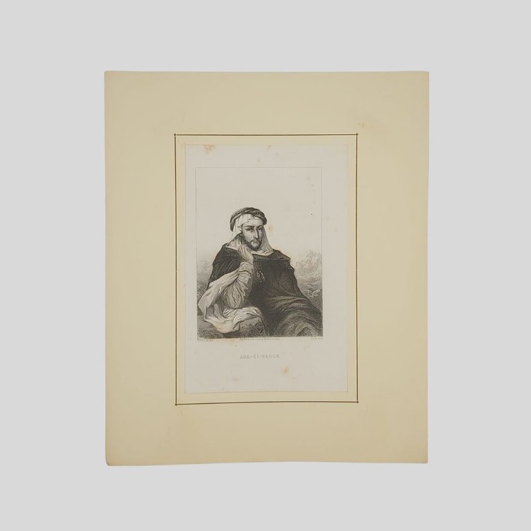 Abd el Kader. Incisione su acciaio di A. Riffaut. Paris, Pernel, s.d. (seconda metà dell’800) mm 160×106 (alla battuta), mm 271×171 (tavola) montata su passeportout mm 325×267. Fioriture.