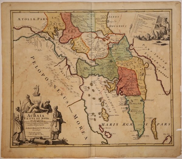 Bella mappa storico-geografica dell'Attica, che fornisce i toponimi nella forma più antica e in quella moderna. La carta , come indicato nel titolo, è una riduzione di quella realizzata da George Wheeler, e pubblicata nella sua opera "Voyage de Dalmatie, de Grece, et du Leuant. ". In alto a destra, una legenda esplicativa dei simboli utilizzati. Pubblicata da J. B. Homann, questa mappa è stata disegnata dal figlio Johann Christoph. Johann Baptist Homann è stato un geografo e cartografo tedesco; nel 1702 fondò la sua casa editrice. Homann acquisì fama come uno dei principali cartografi tedeschi, e nel 1715 fu nominato geografo imperiale dall'imperatore Carlo VI. Nello stesso anno fu anche nominato membro dell'Accademia Prussiana delle Scienze a Berlino. Nel 1716 Homann pubblicò il suo capolavoro Grosser Atlas ueber die ganze Welt. Numerose mappe furono redatte in collaborazione con l'incisore Christoph Weigel. Homann morì a Norimberga nel 1724. Gli successe suo figlio Johann Christoph (1703-1730). L'azienda continuò dopo la sua morte come azienda degli eredi Homann, gestita da Johann Michael Franz e Johann Georg Ebersberger. Dopo successivi cambiamenti nella gestione, l'azienda si sciolse nel 1852. ' Incisione in rame, coloritura coeva, leggere ossidazioni e tracce di colore, qualche strappo nei margini bianchi, per il resto in buone condizioni. Historical map of Attica, marking both classical and modern details, with two large figurative cartouches. Designed by Homann’s son Johann Christoph Homann, this map is a reduction of George Wheeler plate, published in his book "Voyage de Dalmatie, de Grece et du Leuant .". Johann Baptist Homann was a German geographer and cartographer; in 1702 he founded his own publishing house. Homann acquired renown as a leading German cartographer, and in 1715 was appointed Imperial Geographer by Emperor Charles VI. In the same year he was also named a member of the Prussian Academy of Sciences in Berlin. In 1716 Homann published his masterpiece Grosser Atlas ueber die ganze Welt; numerous maps were drawn up in cooperation with the engraver Christoph Weigel the Elder. Homann died in Nuremberg in 1724 and was succeeded by his son Johann Christoph (1703-1730). The company carried on upon his death as Homann heirs company, managed by Johann Michael Franz and Johann Georg Ebersberger. After subsequent changes in management the company folded in 1852. ' In the upper right, a legend explaining the symbols used. Copper engraving, coloring coeval, some foxing, some tears in the white margins, generally in good condition. Cfr.