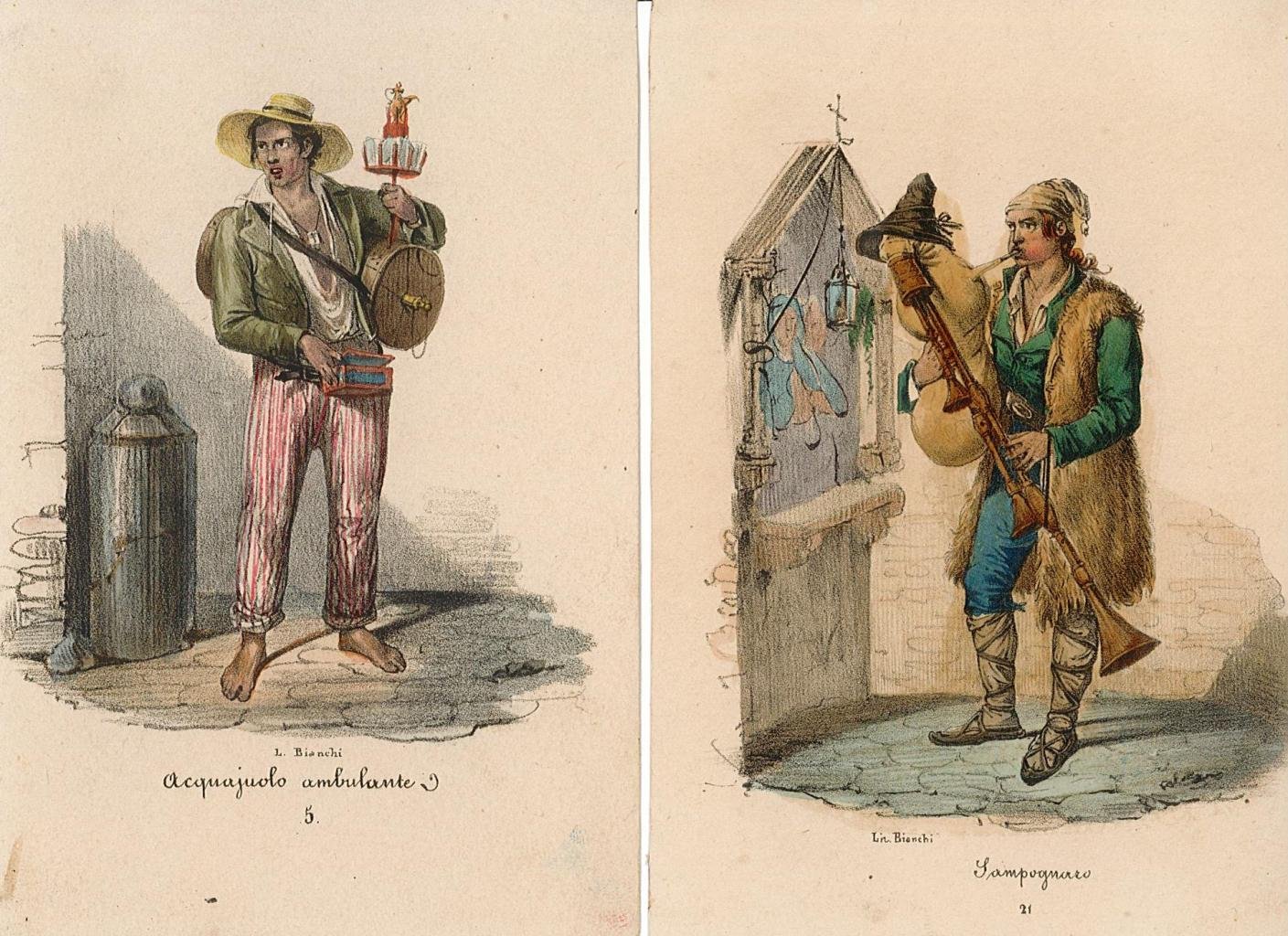 Costumi, antichi ed originali in coloritura coeva, raffiguranti Acquajolo ambulante - Zampognaro. Autore: Bianchi lit. Luogo: Napoli costumi. Anno: 1830 ca. Tecnica: litografia. Dimensioni: mm 120x80 cd.