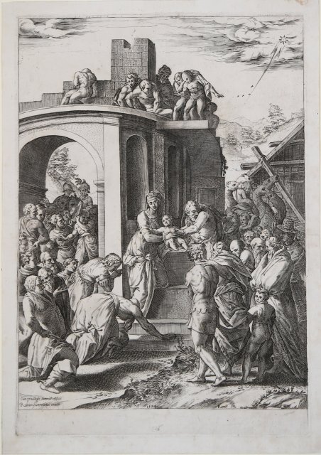 Bulino, 1574, datato in basso al centro e monogrammato in basso a sinistra cAB. Da un soggetto di Rosso Fiorentino.Secondo stato, con la notizia del privilegio papale e il ruolo di inventor di Rosso Fiorentino aggiunti in basso a destra.Bellissima prova, impressa su carta vergata coeva priva di filigrana, con margini, traccia di piega centrale orizzontale, in ottimo sttao di conservazione.Vasari nella sua biografia di Rosso Fiorentino riporta che dopo il Sacco di Roma l’artista fuggì a Perugia dove fu accolto ed ospitato dal pittore Domenico Alfani, per il quale Rosso realizza un disegno raffigurante un’Adorazione dei Magi. Il disegno fu usato poi da Domenico per realizzare la pala d’altare per la chiesa della Madonna dei Miracoli di Castel Rigone. Dopo la sua morte, il modello passò verosimilmente al figlio di Domenico, Orazio. Successivamente il disegno oggi perduto, capitò nella mani di Cherubino Alberti che ne realizzò una traduzione a bulino, a Roma nel 1575.L’incisione risulta in controparte rispetto alla pala d’altare e di conseguenza anche rispetto al disegno preparatorio. Rispetto al dipinto di Alfani, il bulino ha una maggiore intensità espressiva che forse rispecchia più fedelmente il modello del Rosso.L’Adorazione dei Magi è una delle opere più notevoli e accurate nella carriera di Rosso Fiorentino. L’affollamento di figure, a destra e a sinistra, e l’uso di una grande scenografia architettonica, richiama la Battaglia dei Romani e i Sabini, mentre l’ampiezza della scena ricorda il San Rocco che distribuisce la sua eredità, ma nell’Adorazione dei Magi lo spazio è molto più ampio, e le figure sono accostate tra di loro.Il Bambino è tenuto dalla Vergine e da S. Giuseppe ed è seduto su un blocco di pietra, in mezzo a delle antiche rovine, non lontano da una più moderna costruzione di legno, a simboleggiare il Vecchio e il Nuovo Testamento. Così come simbolica è la posizione delle braccia del Bambino, completamente aperte, a ricordare la sua crocifissione. Engraving, lettered at bottom centre '1574' and to right with Alberti's monogram 'cAB'. After Rosso Fiorentino.Second state, inscribed “Cum privilegio summi Pontificis/Rubeus florentinus inven” in the area of the image at the lower left. A very good impression, printed on contemporary laid paper, with margins, trace of central fold, generally in very good condition. Vasari reported in his life of Rosso Fiorentino that after the Sack of Rome, the artist fled to Perugia where painter Domenico Alfani cared him, and that Rosso made for him a cartoon depicting the Adoration of the Magi.The cartoon was then used by Domenico to paint the altarpiece for the church of Madonna dei Miracoli in Castel Rigone. After his death, the model likely passed to the Domenico’s son , Horace. Subsequently, the design now lost, was either acquired or borrowed by Cherubino Alberti who engraved it, in Rome in 1575.The print is in reverse from the altarpiece and hence also from Rosso’s career. Compared to the painting, the dramatic fervor is more evident in Alberti’s print, which more accurately preserve Rosso’s design.The Adoration of the Magi is one of the most remarkable and accurate planned invention of Rosso’s career. The crowding of figures, at the right and left, and the use of a large architectural setting, recalls the Battle of the Romans and the Sabines, while the spaciouness of the scene recalls othe San Rocco distributing his inheritance. However, the space in the Adoration of the Magi is far more ample than in either of other compositions, and the figures are placed more continuously in it.The Child is held by the Virgin and St. Joseph and is sitting on a block of stone that is set amid ruins, not far from a newer wooden building, symbolic of the Old and New Testaments. The child’s position as though on an altar gives to the scene a sacramental quality. His outstretched arms suggests his eventual crucifixion. Cfr. Bartsch XVII.54.12; Carroll, p. 144 n. 48.