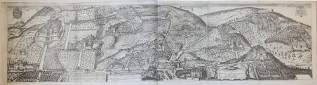 Si tratta del celeberrimo e raro panorama della cittadina di Frascati e delle ville circostanti, viste dall'alto, realizzata dal Greuter nel 1620. Di particolare interesse artistico, storico ed archeologico, la veduta è unica nel suo genere: nessun'altra riuscirà a dare un'immagine altrettanto grandiosa e generale di questo territorio. Dai nomi dei proprietari delle ville, è possibile circoscrivere la realizzazione della veduta, stabilendo come “terminus post quem” i primi mesi del 1618 e come “terminus ante quem” il febbraio 1619. Infatti, l'attuale Villa Lancellotti, già dei Filippini, è indicata come “Palazzo di Roberto Primo”, il quale ne prese possesso solo all'inizio del 1618 e morì nel febbraio del 1619. L'anno successivo, gli eredi vendettero la villa ai Capponi. La veduta è dedicata a monsignor Stefano Pignatelli, segretario del cardinale Scipione Borghese, nipote di papa Paolo V, allora proprietario di tre di queste ville. Lo stemma papale di Paolo V e quello cardinalizio di Scipione campeggiano negli angoli superiori. L'iscrizione dedicatoria, in un elegante carattere corsivo, è posta dentro un cartiglio decorativo, nel margine inferiore, in corrispondenza della villa Borghese. Al centro del cartiglio, lo stemma del Pignatelli. Più a destra, un secondo cartiglio, fiancheggiato da due putti, con i dati editoriali: “Disegnato e dato in luce/da/Matteo Greuter Todesco/in Roma MDCXX/ con licenza de Superiori et/ Con Privileggio di NS. Papa Paulo V per anni X”. Ben un terzo della veduta è dedicato alla proprietà dei Borghese. A iniziare da sinistra: Villa Mondragone; Villa Tuscolana - poi Tuscolana Vecchia - e la villa “Borghesia”, che diventerà poi di proprietà dei Parisi. Seguono: La Rufina - poi villa Falconieri, al tempo proprietà degli Sforza; Villa Rufinella, poi Tuscolana; villa Aldobrandini; villa Sora; villa Altemps - poi Torlonia,;villa Belpoggio - Sciarra, villa Montalto - poi Grazioli, e villa Arrigoni - poi Muti. L'opera del Greuter godette subito di un enorme successo come prova la derivazione in piccolo che fu stampata solo due anni dopo da Giacomo Lauro - Descriptio Tusculi cum villis…, 1622; le copie grandi sono del Blaeu (1663) e del Kircher (1671). Acquaforte e bulino, impressi su tre fogli di carta vergata congiunti, con margini, minimi restauri perfettamente eseguiti, nel complesso in ottimo stato di conservazione. Magnificent and extremely rare view of Frascati and its villas, drawn and engraved by Mattheus Greuter in 1620. From the names of the owners of the villas, it's possible to narrow the realization of the view, establishing as “terminus post quem” the first months of 1618, and as a “terminus ante quem” the February 1619. In fact, the current Villa Lancellotti, formerly of the Filippini, is referred to as “Palazzo di Roberto Primo”, who took possession until early 1618, and died in February 1619. The following year, the heirs sold the villa to the Capponi. The view is dedicated to Monsignor Stefano Pignatelli, secretary of Cardinal Scipione Borghese, nephew of Pope Paul V, then owner of three of these villas. The papal coat of arms of Paul V and Cardinal Scipione stand out at the top corners. The cartouche with dedicatory inscription, in an elegant cursive, is in the lower margin, in correspondence of Villa Borghese. At the top center center of the cartouche, the coat of arms of the Pignatelli. A second cartouche, flanked by two putti, with imprint “Disegnato e dato in luce/da/Matteo Greuter Todesco/in Roma MDCXX/ con licenza de Superiori et/ Con Privileggio di NS. Papa Paulo V per anni X” The panoramic view of Frascati, depicts villas of the papal nobility, their waterworks and gardens including, from left to right, Villa Tuscolana, Villa Mondragone, Villa Borghese, Villa Rufina, La Rufinella, Villa Aldobrandina Belvedere, Sora, Como-Ludovisi, Belpoggio, Acquaviva and Arrigone. Etching and engraving on three sheets, with margins, some paper folds, small repairs, generally in very good condition. Cfr.