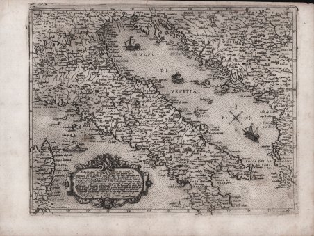 Nel cartiglio in basso a sinistra si legge: Al molto Mag.co m. Andrea Gradenico del Clariss.o m. Zorzi fu del Clariss.o m. Iacomo miei patroni oss.mi Ricordomi che un giorno in Casa Sua Mag.co Sig.r mio ragionando ura Ma co[n] il sudetto Cl.mo suo padre gli fece alcuni quesiti sopra le cose di Geographia sop.a il qual suggetto udì belli discorsi, di modo che vedendola in cosi tenera etade tanto adornata di questa bella scientia. Rara in molti ne presi da me assai admiration, et per tal causa, si come gli era ser.r Affettionato, li diventai affettionatissi.o: sic he havend io fatto fare adesso il presente Golfo di Vinegia con parte dell’Italia in questa picciola forma, ho volute dedicarglilo per mostrarmegli con perpetuo testimonio affettionatiss.o di Casa di sua Mag.ia alla buona gratia di la quale mi racc.o Di Venegia alli 6 di ott.e 1571. Di vostra Magnificia Humile Servo Giovanni Fran.co Camotio. Orientazione fornita da una rosa dei venti nel Mar Adriatico, il nord è in alto. Carta priva di scala grafica. Graduazione ai margini di grado in grado, da 38° 32’ a 45° 28’ di latitudine e da 27° 10’ a 40° 20’ (29°50’ a 43°20’ in alto) di longitudine. Esemplare nel secondo stato di tre, con la dedica nel cartiglio e prima della numerazione. ' “La carta, molto simile per impostazione ed informazioni a quella di Domenico Zenoi (1567), non contempla tutta la penisola; mancano infatti parte del Piemonte, della Calabria, della Corsica e del tutto Sicilia e Sardegna. Uscita come pubblicazione separata, allo stesso modo di tutte le carte di piccolo formato del Camocio, venne successivamente numerata ed inserita nel celebre Isole famose, porti, fortezze, e terre marittime sottoposte alla Ser.ma Sig.ria di Venetia, adaltri Principi Christiani, et al Sig.or Turco, novamente poste in luce, in Venezia. Una prova di stampa dell’opera, con il cartiglio privo di qualsiasi iscrizione, è conservata nella raccolta cinquecentesca dell’Archivio di Stato di Torino (Z.III.4) ed in una, di formato ridotto, del Museo Correr (E 1447) già descritta da Gallo; circostanza che dimostra come le carte di piccolo formato del Camocio circolassero già prima di essere inserite nelle Isole Famose. Alla morte dell’editore (1575), la lastra fu acquisita da Donato Bertelli che la ristampò aggiungendo una numerazione sequenziale. Tale tiratura è quella inserita nell’edizione dell’opera che reca nel frontespizio l’imprint In Venetia alla libreria del segno di San Marco” (cfr. Bifolco-Ronca, Cartografia e topografia italiana del XVI secolo, p. 1932). Magnifica prova, ricca di toni, impressa su carta vergata coeva, con margini, in perfetto stato di conservazione. Rara. Bibliografia Bifolco-Ronca (2018): p. 1932, tav. 918, II/III; Almagià (1929): p. 27, a; Bifolco-Ronca (2014): n. 12; Borri (1999): n. 45; Borri (2010): n. 51; Gallo (1950): p. 97, n. 3 e p.99, n. 18; Lago (1992): p. 170; Lago (2002): p. 286, fig. 285; Tooley (1939): n. 592. In the cartouche at lower left: Al molto Mag.co m. Andrea Gradenico del Clariss.o m. Zorzi fu del Clariss.o m. Iacomo miei patroni oss.mi Ricordomi che un giorno in Casa Sua Mag.co Sig.r mio ragionando ura Ma co[n] il sudetto Cl.mo suo padre gli fece alcuni quesiti sopra le cose di Geographia sop.a il qual suggetto udì belli discorsi, di modo che vedendola in cosi tenera etade tanto adornata di questa bella scientia. Rara in molti ne presi da me assai admiration, et per tal causa, si come gli era ser.r Affettionato, li diventai affettionatissi.o: sic he havend io fatto fare adesso il presente Golfo di Vinegia con parte dell’Italia in questa picciola forma, ho volute dedicarglilo per mostrarmegli con perpetuo testimonio affettionatiss.o di Casa di sua Mag.ia alla buona gratia di la quale mi racc.o Di Venegia alli 6 di ott.e 1571. Di vostra Magnificia Humile Servo Giovanni Fran.co Camotio. Orientation provided by a wind rose in the Adriatic Sea, north is at the top. Map without graphic scale. Graduation at the margins from degree to degree, from 38° 32' to 45° 28' of latitude and from 27° 10' to 40° 20' (29°50' to 43°20' at the top) of longitude. Exemple in the second state of three, with dedication in the cartouche and before numbering. ' The map, very similar in setting and information to that of Domenico Zenoi (1567), does not cover the entire peninsula, missing in fact part of Piedmont, Calabria, Corsica and all of Sicily and Sardinia. Issued as a separate publication, in the same way as all the small-format maps by Camocio, it was later numbered and included in the famous Isole famose, porti, fortezze, e terre marittime sottoposte alla Ser.ma Sig.ria di Venetia, adaltri Principi Christiani, et al Sig.or Turco, novamente poste in luce, in Venezia. A print proof of the work, with the cartouche devoid of any inscription, is preserved in the sixteenth-century collection of the State Archives of Turin (Z.III.4) and in one, of reduced size, of the Correr Museum (E 1447) already described by Gallo; circumstance that shows how the small-format maps of Camocio circulated even before being included in the Isole Famose. At the death of the publisher (1575), the plate was acquired by Donato Bertelli who reprinted it by adding a sequential numbering. This edition is the one included in the edition of the work that bears on the title page the imprint In Venetia alla libreria del segno di San Marco. (cf. Bifolco-Ronca, Cartografia e topografia italiana del XVI secolo, p. 1932). Magnificent proof, rich in tone, printed on contemporary laid paper, with margins, in perfect condition. Rare. ' Literature Bifolco-Ronca (2018): p. 1932, tav. 918, II/III; Almagià (1929): p. 27, a; Bifolco-Ronca (2014): n. 12; Borri (1999): n. 45; Borri (2010): n. 51; Gallo (1950): p. 97, no. 3 and p.99, no. 18; Lago (1992): p. 170; Lago (2002): p. 286, fig. 285; Tooley (1939): no. 592. Cfr.
