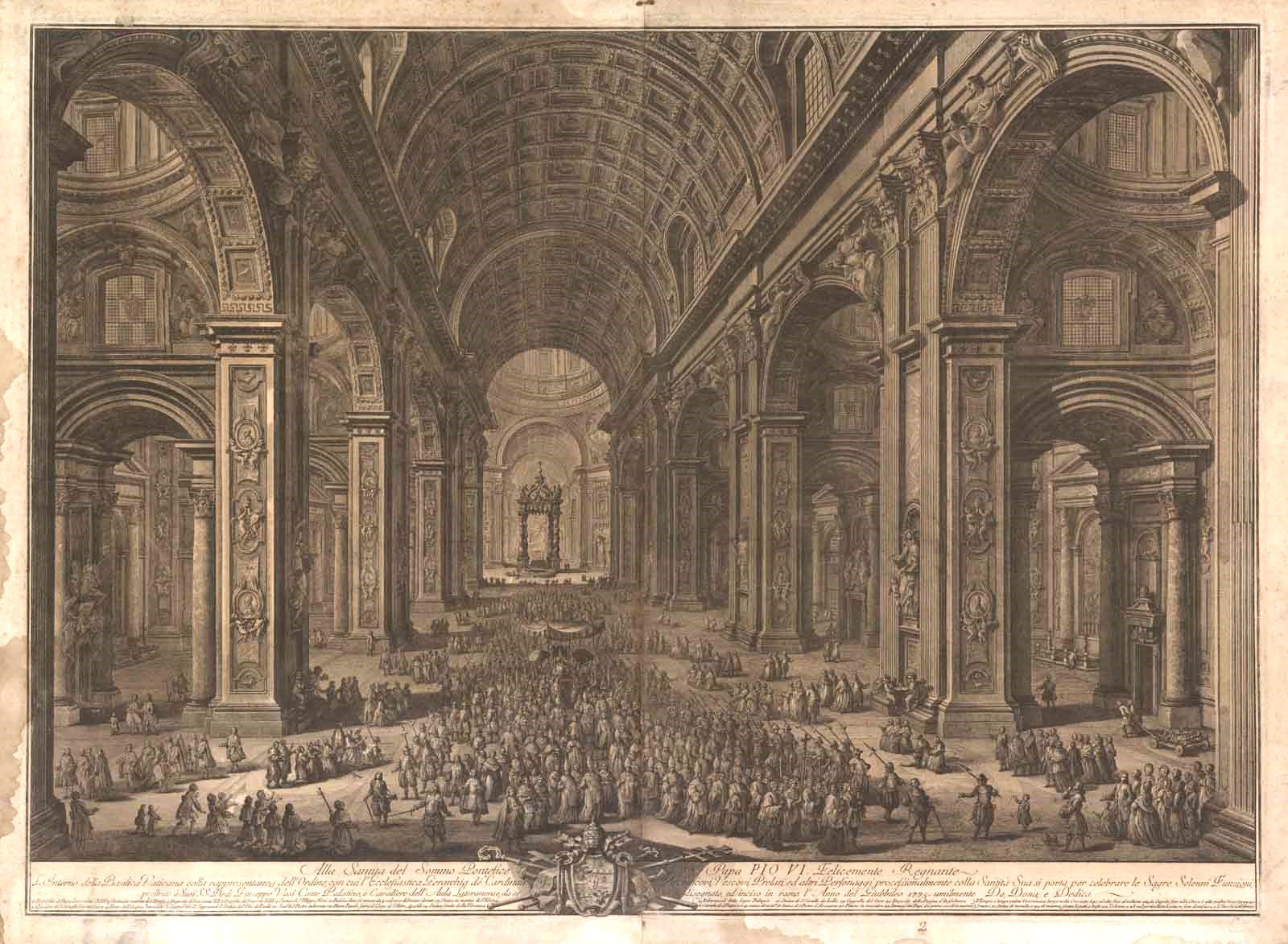 Imponente raffigurazione dell'interno della Basilica di San Pietro, su due fogli giuntati, "colla rappresentanza dell'Ordine, con cui l'Ecclesiastica Gerarchia de Cardinali Arcivescovi, Prelati ed altri Personaggi processionalmente colla Santità Sua si porta per celebrare le Sagre Solenni Funzioni.". L'opera venne disegnata ed incisa nell'anno del giubileo del 1775 da Giuseppe Vasi e da questi donata e dedicata a Papa Pio VI "felicemente regnante". In calce alla veduta ventidue rimandi che permettono una chiara lettura dell'immagine. Alcuni segni del tempo, ma senza troppo fastidio.