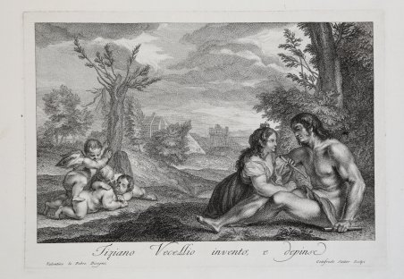 Acquaforte e bulino, circa 1749, firmata in lastra in basso a destra. Da un dipinto di Tiziano Vecellio.Intorno al 1749 fu deciso di ripubblicare le tavole eseguite da Lefevre per il famoso set "Opera Selectiora". A causa di un cambiamento nel gusto e perché si erano consumati, le lastre vennero ritoccate con lavori di rifinitura di artisti come Giuseppe Waggner e Johann Gottfried Saiter o completamente rifatti. La raccolta venne pubblicata come "Le opere scelte dipinte da Tiziano Vecellio di Cadore, e da Paolo Cagliari di Verona" (Venezia, 1749). Una seconda edizione, con l'aggiunta di opere della collezione di Lovisa, fu pubblicata da Teodoro Viero (Venezia, 1786) con un titolo diverso: "Raccolta di Opere Scelte Dipinte da Tiziano Vecellio, Antonio Regillo detto il Pordenone, Giacomo Robusti detto il Tintoretto, Paolo Calliari Veronese, Dario Varotari detto il Padoanino, Li Bassani, Giacomo Palma, Giuseppe Salviati, e vari altri celebri Maestri della Scola Veneziana, che fiorirono ne 'tempi posteriori. Disegnate, ed Incise in parte Da Valentino Le Febre Di Bruxelles, ed in parte Da Silvestro Manaigo, e da Andrea Zucchi Veneti ".Bellissima prova, con margini, in perfetto stato di conservazione. Allegory on the three ages of man, after Titian; landscape with in the right foreground, seated on the ground, a naked young man and a woman playing pipe, on the left a winged putto stepping over two sleeping children, and beyond an old man contemplating a skull. The painting is now in the National Gallery of Scotland, Edinburgh.From 'Raccolta Di Opere Scelte'.Around 1749 it was decided that the plates executed by Lefevre for the famous "Opera Selectiora" set were to be republished. Because of a change in taste, and because they had worn off, the plates were either retouched with burin work by artists such as Giuseppe Waggner and Johann Gottfried Saiter, or completely remade. The set was published as "Le opere scelte dipinte da Tiziano Vecellio di Cadore, e da Paolo Cagliari di Verona" (Venice, 1749). A second edition, with added plates from the collection of Lovisa, was published by Teodoro Viero (Venice, 1786) under a different title: "Raccolta Di Opere Scelte Dipinte da Tiziano Vecellio, Antonio Regillo detto il Pordenone, Giacomo Robusti detto il Tintoretto, Paolo Calliari Veronese, Dario Varotari detto il Padoanino, Li Bassani, Giacomo Palma, Giuseppe Salviati, e varj altri celebri Maestri della Scola Veneziana, che fiorirono ne' tempi posteriori. Disegnate, ed Incise in parte Da Valentino Le Febre Di Bruxelles, ed in parte Da Silvestro Manaigo, e da Andrea Zucchi Veneti". [See "Jacopo Tintoretto e suoi incisori", Milan 1994, cat. 95, page 96]. Cfr.