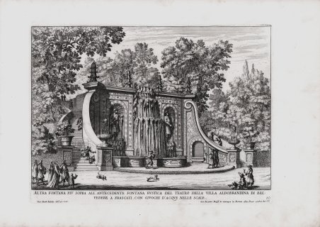 Tavola della serie ' “Le Fontane di Roma nelle Piazze, e luoghi publici della città ' e ' Le fontane delle ville di Frascati, nel Tusculano” dita da Giovanni Giacomo de Rossi ' alla Pace, senza data ma intorno al 1680. Falda, che muore a Roma nel 1678, incise le tavole del primo e del secondo volume, intitolati rispettivamente dal titolo ' Le Fontane di Roma nelle Piazze, e luoghi publici della città ' e ' Le fontane delle ville di Frascati, nel Tusculano. Le tavole del terzo e quarto volume, ' Le fontane ne' palazzi e ne' giardini di Roma ' e ' Le fontane del giardino Estense in Tivoli, furono, invece, incisi da Giovanni Francesco Venturini. Falda, nativo di Valduggia, all'età di 14 anni fu inviato a Roma ed affidato alle cure di uno zio che lo segnalò a Gian Lorenzo Bernini. Ma fu l'incontro con lo stampatore Giovanni Giacomo De Rossi a segnare una svolta nella carriera artistica del Falda: infatti il suo talento venne indirizzato dall'editore all'arte dell'incisione. Il suo tirocinio nella tipografia romana venne benevolmente accolto alla corte papale, tanto che Alessandro VII gli affidò l'incarico di disegnare le fabbriche della residenza di Castel Gandolfo. Nel 1665 Falda diede alle stampe per l'editore De Rossi il suo capolavoro: le tavole del primo libro del ' Nuovo Teatro delle fabbriche, et edificii, in prospettiva di Roma moderna sotto il felice pontificato di n. s. Alessandro VII, al quale seguirono, tra il 1665 e il '69, il secondo ed il terzo. L'opera aveva lo scopo di divulgare la nuova immagine di Roma: il Papa, infatti, decise di aprire nuove strade, di abbellire con fontane e monumenti la città, anche a dimostrazione della potenza finanziaria e culturale della sua famiglia. Con il ' Nuovo Teatro, come poi con le successive raccolte dedicate alle fontane e ai palazzi, Falda diventò il divulgatore di questi aspetti; le sue vedute incise, caratterizzate dall'attenzione sia alle regole prospettiche sia agli effetti scenografici, sfruttano abilmente il vigore della linea e la ricchezza del contrasto fra bianco e nero, in sintonia con i criteri spaziali dell'arte barocca. Acquaforte, impressa su carta vergata coeva, in ottimo stato di conservazione. Bibliografia The Illustrated Bartsch, vol. 47/2, pp.4-28. Olschki, Choix, XI, 16899; Rossetti 4830. Plate from the series ' Le Fontane di Roma, published by Giovanni Giacomo de Rossi alla Pace, undated but before 1680. Falda, who died in Rome in 1678, engraved the plates of the first and second volume, entitled respectively ' Le Fontane di Roma nelle Piazze, e luoghi publici della città ' and ' Le fontane delle ville di Frascati, nel Tusculano. The plates of the third and fourth volume, ' Le fontane ne' palazzi e ne' giardini di Roma ' and ' Le fontane del giardino Estense in Tivoli, were instead engraved by Giovanni Francesco Venturini. ' Falda, a native of Valduggia, at the age of 14 was sent to Rome and entrusted to the care of an uncle who pointed him out to Gian Lorenz Bernini. But it was the meeting with the printer Giovanni Giacomo De Rossi that marked a turning point in Falda's artistic career: in fact his talent was directed by the publisher to the art of engraving. His apprenticeship in the Roman printing house was well received at the papal court, so that Alexander VII entrusted him with the task of designing the buildings of the residence of Castel Gandolfo. In 1665 Falda printed for the publisher De Rossi his masterpiece: the tables of the first book of the ' Nuovo Teatro delle fabbriche, et edificii, in prospettiva di Roma moderna sotto il felice pontificato di n. s. Alessandro VII, which was followed, between 1665 and '69, by the second and third books. The work was intended to spread the new image of Rome: the Pope, in fact, decided to open new streets, to embellish the city with fountains and monuments, also to demonstrate the financial and cultural power of his family. With the ' Nuovo Teatro, ' as with the subsequent collections dedicated to fountains and palaces, Falda became the popularizer of these aspects. His etched views, characterized by attention to both the rules of perspective and the scenographic effects, skillfully exploit the vigor of the line and the richness of the contrast between black and white, in tune with the spatial criteria of Baroque art. Etching, printed on contemporary laid paper, in excellent condition. Bibliografia The Illustrated Bartsch, ' vol. 47/2, pp.4-28. Olschki, Choix, XI, 16899; Rossetti 4830. Cfr.