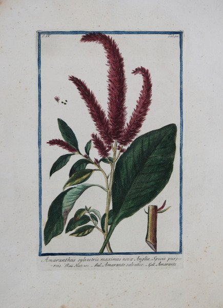 Tavola botanica tratta dal monumentale Hortus Romanus Juxta Systema Tournefortianum Paulo Strictius Distributus A Georgio Bonelli Monregalensi In Subalpinis, Publico Medicinae Professore: Specierum Nomina Suppeditante, Praestantiorum, Quas Ipse Selegit, Adumbrationem Dirigente Liberato Sabbati Maevaniensi In Umbria Chirurgicae Professore, Et Horti Custode; Adjectis Unicuique Volumini Rariorum Plantarum Tabulis C. Aere Incisis. Tom. I. (- Tom. VII.) L’opera viene stampata a Roma durante l’arco di ben 22 anni e da diversi editori: a spese di Bouchard e Gravier: Paolo Giunchi, 1772-1780-Tipografia Salomoni, 1784-Giovanni Zempel, 1793. Prima edizione di questa monumentale opera di botanica, sicuramente la più vasta e riccamente illustrata tra quelle prodotte in Italia fino ad allora. Intorno al 1770 gli editori francesi Bouchard e Gravier, avendo intenzione di dare alle stampe un catalogo illustrato dell’Orto botanico di Roma, ne proposero la direzione al medico piemontese Giorgio Bonelli (1724-1782), allora docente presso l’università romana. La cura della preparazione dei campioni per l’apparato iconografico fu invece affidata a Liberato Sabbati (1714-1778), un farmacista umbro, che era allora custode dell’Orto medesimo. Il primo volume uscì nel 1772 con una ricca introduzione del Bonelli, in cui questi fornisce un resoconto dei più recenti sviluppi della botanica e dei nuovi sistemi di classificazione e adduce poi i motivi della sua preferenza per il sistema elaborato da Joseph Pitton de Tournefort, a suo avviso più semplice e adatto all’apprendimento. Per ragioni ignote Bonelli abbandonò tuttavia l’impresa. Nel 1774, a partire dal secondo volume, essa fu presa in mano e poi condotta a termine da Niccolò Martelli (1735-1829), docente di botanica della Sapienza. Questi dette all’opera un’impostazione più linneana, pur continuando ad avvalersi della collaborazione di Liberato Sabbati fino alla sua morte, che avvenne nel 1778 al termine della pubblicazione dei primi cinque volumi. Il suo posto fu quindi preso dal figlio Costantino Sabbati. L’Hortus romanus contiene la classificazione delle varie specie di piante ospitate nell’Orto Botanico di Roma, che, stando a quanto affermato nella Horti Romani brevis historia che apre il primo volume, fu fondato a metà del Quattrocento sotto il pontificato di Niccolò V. In realtà i primi orti botanici italiani furono quelli creati a Padova e a Pisa intorno al 1545. L’Orto Romano sorse poco tempo dopo e, ampliatosi più volte, nel 1660 fu trasferito dalla sede vaticana al Gianicolo, dove ancora oggi si trova. La maggior parte delle tavole numerate non sono firmate, ma alcune sono firmate come incise da Magdalena Bouchard Il primo volume è dedicato dagli editori, Joannes Bouchard et Joannes Josephus Gravier, al Papa Clemente XIV; il secondo, al Cardinale Bernis; il terzo, al Cardinale Zelada; il quarto, al Cardinale Giraud. Il sesto volume è dedicato - dall'autore, Nicolaus Martelli - al cardinale Boncompagni. Acquaforte, finemente colorata a mano in epoca, in perfetto stato di conservazione. Bibliografia K. Nissen, ' Die botanische Buchillustration, 2 v. & suppl. (1951-1966); Great Flower Books p. 51. Hunt 629. Cleveland Botanical 509. Dunthorne 45. Pritzel 976. Nissen, BBI 200. Stafleu & Cowan TL2 634. Botanical plate from the Hortus Romanus Juxta Systema Tournefortianum Paulo Strictius Distributus A Georgio Bonelli Monregalensi In Subalpinis, Publico Medicinae Professore: Specierum Nomina Suppeditante, Praestantiorum, Quas Ipse Selegit, Adumbrationem Dirigente Liberato Sabbati Maevaniensi In Umbria Chirurgicae Professore, Et Horti Custode; Adjectis Unicuique Volumini Rariorum Plantarum Tabulis C. Aere Incisis. Tom. I. (- Tom. VII.) The work was printed in Rome over a period of 22 years and by different publishers: at the expense of Bouchard and Gravier: Paolo Giunchi, 1772-1780-Tipografia Salomoni, 1784-Giovanni Zempel, 1793. First edition of this monumental work of botany, certainly the most extensive and richly illustrated among those produced in Italy until then. Around 1770, the French editors Bouchard and Gravier, having the intention of printing an illustrated catalog of the Botanical Garden of Rome, proposed the direction to the Piedmontese doctor Giorgio Bonelli (1724-1782), then a professor at the University of Rome. The care of the preparation of samples for the iconographic apparatus was instead entrusted to Liberato Sabbati (1714-1778), an Umbrian pharmacist, who was then custodian of the Garden itself. The first volume was published in 1772 with a rich introduction by Bonelli, in which he gives an account of the most recent developments in botany and new systems of classification and then gives the reasons for his preference for the system developed by Joseph Pitton de Tournefort, in his opinion simpler and more suitable for learning. For unknown reasons Bonelli abandoned the enterprise. In 1774, starting with the second volume, it was taken over and then completed by Niccolò Martelli (1735-1829), professor of botany at the Sapienza. Martelli gave the work a more Linnean approach, while continuing to use the collaboration of Liberato Sabbati until his death in 1778 at the end of the publication of the first five volumes. His place was taken by his son Costantino Sabbati. The Hortus romanus contains the classification of the various species of plants housed in the Botanical Garden of Rome, which, according to what is stated in the Horti Romani brevis historia that opens the first volume, was founded in the mid-fifteenth century under the pontificate of Nicholas V. In reality, the first Italian botanical gardens were created in Padua and Pisa around 1545. The Roman Garden arose shortly thereafter and, expanded several times, in 1660 was transferred from the Vatican to the Janiculum, where it is still located today. Most of the numbered plates are unsigned, but a few are signed as engraved by Magdalena B