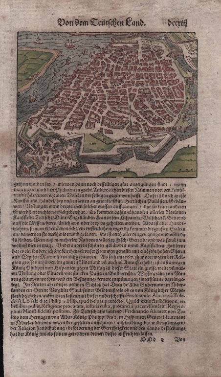 Tavola tratta dalla ' Cosmographiae Universalis, edizione in tedesco, Basilea, seconda metà del XVI secolo.La ' Cosmographiae Universalis ' di Sebastian Münster (1488-1552), stampata per la prima volta Basilea nel 1544 dall’editore Heinrich Petri, venne più volte aggiornata e aumentata di nuove carte geografiche e rappresentazioni urbane nelle sue numerose edizioni che arrivano all’inizio del secolo successivo. Münster aveva lavorato a raccogliere informazioni al fine di ottenere un'opera che non deludesse le aspettative e, dopo un'ulteriore pubblicazione in tedesco abbellita da 910 stampe su legno, giunse nel 1550 all'edizione definitiva in latino, illustrata da 970 silografie. Vi furono poi numerose edizioni in diverse lingue, fra cui latino, francese, italiano, inglese e ceco. Dopo la sua morte di Münster (1552), Heinrich Petri prima, e il figlio Sebastian poi, continuarono la pubblicazione dell’opera. La ' Cosmographia universalis ' fu uno dei libri più popolari e di successo del XVI secolo, e vide ben 24 edizioni in 100 anni: l'ultima edizione tedesca venne pubblicata nel 1628, molto tempo dopo la morte dell'autore. La ' Cosmographia ' conteneva non solo le ultime mappe e vedute di tutte le città più famose, ma anche una serie di notizie enciclopediche di dettagli relative al mondo conosciuto, e sconosciuto. Il particolare successo anche commerciale di quest'opera fu dovuto in parte alle belle incisioni (tra i cui autori si possono citate Hans Holbein il Giovane, Urs Graf, Hans Rudolph Manuel Deutsch, David Kandel). Silografia, bella coloritura a mano, in buone condizioni. Plate taken from the ' Cosmographiae Universalis, German edition, Basel, second half of the 16th Century. The ' Cosmographiae Universalis ' of Sebastian Münster (1488-1552), printed for the first time in Basel in 1544 by the publisher Heinrich Petri, was updated several times and increased with new maps and urban representations in its many editions until the beginning of the next century. Münster had worked to collect information in order to obtain a work that did not disappoint expectations and, after a further publication in German embellished with 910 woodblock prints, arrived in 1550 to the final edition in Latin, illustrated by 970 woodcuts. There were then numerous editions in different languages, including Latin, French, Italian, English and Czech. After his death in Münster (1552), Heinrich Petri first, and then his son Sebastian, continued the publication of the work. The ' Cosmographia universalis ' was one of the most popular and successful books of the 16th century, and saw as many as 24 editions in 100 years: the last German edition was published in 1628, long after the author's death. The ' Cosmographia ' contained not only the latest maps and views of all the most famous cities, but also a series of encyclopedic details related to the known, and unknown, world. The particular commercial success of this work was due in part to the beautiful engravings (among whose authors can be mentioned Hans Holbein the Younger, Urs Graf, Hans Rudolph Manuel Deutsch, David Kandel). Woodcut, beautiful hand-coloring, in good condition. Cfr.