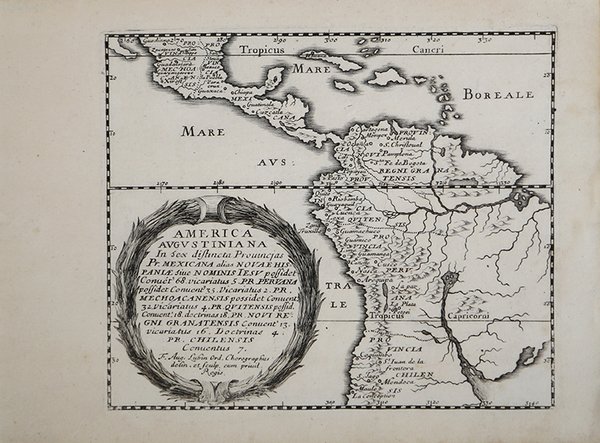 Carta geografica tratta dal rarissimo ' Orbis Augustinianus sive Conventuum Ordinis Eremitarum Sanctii Augustini Chorographica et Topographica Descriptio ' edito a Parigi nel 1659 e ristampato poi nel 1672.L’opera realizzata dal Lubin, è molto simile nella sua concezione, a quella realizzata per l’ordine dei Francescani nel 1649 e vuole rappresentare le province nelle quali è presente l’ordine degli Agostiniani, con l’ubicazione dei conventi. L'Ordine degli Eremitani di Sant'Agostino (in latino Ordo Eremitarum Sancti Augustini) è un istituto religioso che la tradizione fa risalire le origini a Sant'Agostino. Ufficialmente l'Ordine sorse nel 1244 dall'unione, promossa dal cardinale Riccardo Annibaldi e sancita da papa Innocenzo IV, delle fraternità di eremiti di Tuscia in un'unica famiglia religiosa sotto la guida di un priore generale e con la regola di Sant'Agostino. Nel 1256 agli eremitani di sant'Agostino vennero unite altre congregazioni. Incisione in rame, in perfetto stato di conservazione. Molto rara. Map taken from the very rare ' Orbis Augustinianus sive Conventuum Ordinis Eremitarum Sanctii Augustini Chorographica et Topographica Descriptio ' published in Paris in 1659 and later reprinted in 1672. The work made by Lubin, is very similar in its conception, to the one made for the Franciscan order in 1649 and is intended to represent the provinces in which the Augustinian order is present, with the location of the convents. The Order of the Hermits of St. Augustine (in Latin Ordo Eremitarum Sancti Augustini) is a religious institute that tradition traces its origins to St. Augustine. Officially, the Order arose in 1244 from the union, promoted by Cardinal Riccardo Annibaldi and sanctioned by Pope Innocent IV, of the fraternities of hermits of Tuscia into a single religious family under the leadership of a prior general and under the rule of St. Augustine. In 1256 the hermits of St. Augustine were joined by other congregations. Copperplate engraving, in perfect condition. Very rare. Cfr.