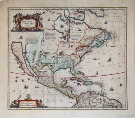 La prima carta del solo Nord America mai pubblicata in un atlante olandese. Nel 1604, Jodocus Hondius (1563-1612) - probabilmente tramite Cornelis Claesz - acquistò le matrici in rame dell'Atlas sive cosmographicae meditationes de fabrica mundi ' di Gerard Mercator all’asta. Aggiunse circa 40 mappe, comprese nuove mappe dei continenti e importanti mappe regionali delle Americhe, prima di pubblicare una nuova edizione dell’opera, nel 1606, in concorrenza con il ' Theatrum Orbis Terrarum ' di Ortelius. Poiché molte delle mappe erano più aggiornate, la raccolta di Mercator & Hondius sostituì effettivamente il ' Theatrum ' di Ortelius. ' L’atlante del 1606 include tutte le 107 mappe dell’edizione del 1595, oltre a 37 nuove mappe, abilmente incise dallo stesso Hondius. La seconda edizione della raccolta seguì già nel 1607/08, mentre la prima edizione in un’altra lingua, il francese, fu messa sul mercato nel 1609. Apparentemente questa fu considerata come la terza edizione, perché nel 1611 apparve l'Editio Quarta, ' con un totale di 150 mappe. Dopo la morte di Jodocus Hondius (1612) la sua vedova e i suoi figli continuarono la stampa dell’atlante. Jodocus Junior ( o Jodocus II, 1594-1629) produsse diverse ristampe tra il 1613 e il 1619, sempre con le stesse 150 mappe; nel 1619 furono invece aggiunte sei nuove mappe. Dopo il 1620 la pubblicazione venne curata da Hendrick (Henricus) Hondius (1597-1651), il secondo figlio di Jodocus senior. Varie edizioni apparvero, nel 1623, 1628 e 1630. Hendrick fu il primo ad apportare dei veri cambiamenti: nell’edizione del 1628 firmò alcune mappe di Mercatore con il proprio nome. Nel 1630, quando probabilmente stava già collaborando con suo cognato Johannes Janssonius, aggiunse nove nuove carte. La prima edizione della mappa, firmata da Hendrick Hondius è databile al 1636/39; successivamente la lastra, senza alcuna modifica, venne ristampata da Janssonius, Visscher ed Allard. Nel 1694 Petrus Schenk si aggiudica in un'asta pubblica tutte le lastre dell'Atlas Major ' di Janssonius e comincia subito a pubblicare questa mappa con il suo indirizzo: ' Amstelodami, Penes Gerardum Valck et Petrus Schenk. Dopo il 1700, Schenk aggiorna la mappa sulla base della più avanzata geografia di Guillaume de L'Isle. Si tratta del terzo stato della carta di Hondius, con l'imprint di Valck e Schenk. “Henricus Hondius' beautifully engraved map of North America had greater influence than any other to date in perpetuating the theory of California as an island. This was because it was disseminated through the medium of his powerful Dutch publishing house. None of the earlier California as an island maps had reached such a wide audience. The 1630s were a decade of constant development in the houses of Blaeu and Hondius. It is interesting to note that Blaeu never produced a single sheet map of North America; both Willem and Joan relied upon that of the whole continent first produced in 1617, throughout their publishing history. During this decade Joannes Janssonius became an active partner of Hondius, and although this map bears no imprint it is assigned to the latter on the basis that at the same time a map of South America appeared displaying his name. Cartographically this map is a careful composition of many different sources and illustrates well the current state of knowledge. The depiction and nomenclature of the west, along with that of the insular California, derive directly from the Henry Briggs The North Part of AMERICA, 1625. A legend placed strategically over the north-west coastline offers the opportunity to discontinue a coastline least understood. An unnamed lake still feeds a Rio del Norto flowing incorrectly south-west into what should be the headwaters of the Gulf of California. On the east bank of this river is Real de Nueua Mexico, or Santa Fe. The Gulf of Mexico and the Florida peninsula originate from the Hessel Gerritsz chart of c.1631. The east coast, however, is harder to. Valck & Schenk edition of the earliest separate map of the North America to appare in any Dutch Atlas, first published by Hendrick Hondius in 1636/39, then by Janssonius and often included in the composite Visscher and Allard atlases. In 1604, Jodocus Hondius (1563-1612) – probably trought Cornelis Claesz - bought the copperplates of Mercator’s ' Atlas sive cosmographicae meditationes de fabrica mundi ' at the auction of Gerard Jr.’s effects. He added about 40 maps, including new maps of the Continents and important regional maps of the Americas, before publishing a new edition of the Atlas, in 1606, in competition with Ortelius’ ' Theatrum Orbis Terrarum. As many of the maps were more up-to-date, the Mercator-Hondius Atlas effectively superseded Ortelius’ ' Theatrum. ' This atlas from 1606 include all 107 maps from the 1595 edition, as well as 37 new maps, skillfully engraved by Hondius, of various authors. The second edition of the Mercator-Hondius atlas followed as soon as 1607/08. The first edition in another language, French, was put on the market in 1609. Apparently this one was regarded as the third edition, because in 1611 ' Editio Quarta ' appeared with a total of 150 maps. After the death of Jodocus Hondius in 1612 his widow and sons continued the publication of the ' Atlas. ' For instance Jodocus Junior (1594-1629) produced several new editions of the ' Editio Quarta ' between 1613 and 1619, each with the same 150 maps. Finally in 1619 the last edition of this atlas followed, to which six new maps were added. After 1620 the publication of the ' Atlas ' was continued by Henricus Hondius (ca. 1596/97-1651), the second son of Jodocus senior. Various editions appeared, in 1623, 1628 and 1630. Henricus Hondius was the first to make some real changes: in the 1628 edition he provided some Mercator maps with his own name. In 1630, when he was probably already cooperating with his brother-in- law Johannes Janssonius, Henricus added nine new maps. In 169
