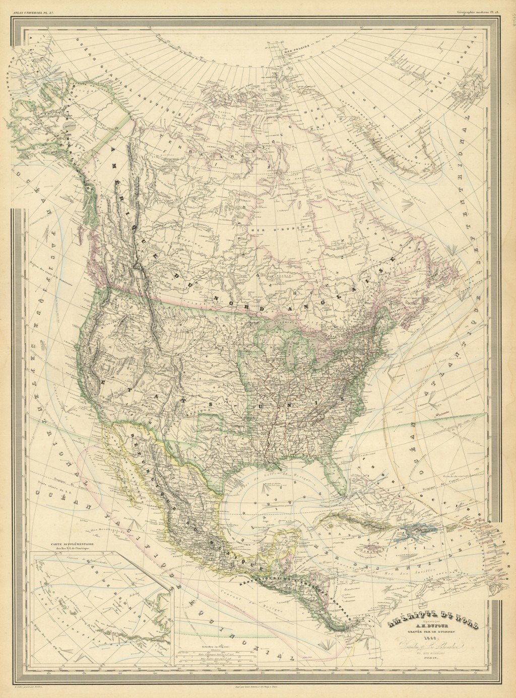 Carta geografica, antica ed originale, con coloritura coeva ai confini. Mappa inserita nell'opera "Atlas Universel Physique, Historique et Politique de Géographie Ancienne et Moderne. composé et dressé par H. Dufour gravé sur acier par Ch. Dyonnet" edita a Parigi dagli editori Paulin e Le Chevalier nel 1860. Autore: Dufour scrisse & Ch. Dyonnet inc. Luogo: America settentionale. Anno: 1860. Tecnica: incisione in acciaio. Dimensioni: 753x550 (813x585 mm il foglio).