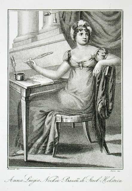 Stampa antica originale raffigurante il ritratto della scrittrice Anne-Louise Germaine Necker, baronessa di Stael-Holstein, meglio nota con il nome di Madame de Stael, in allegato pagine descrittive. Piccole gore. Inserita nell'opera "Serie di vite e ritratti de Famosi Personaggi degli ultimi Tempi" edita da Bettalli e Fanfani a Milano dal 1815 al 1818