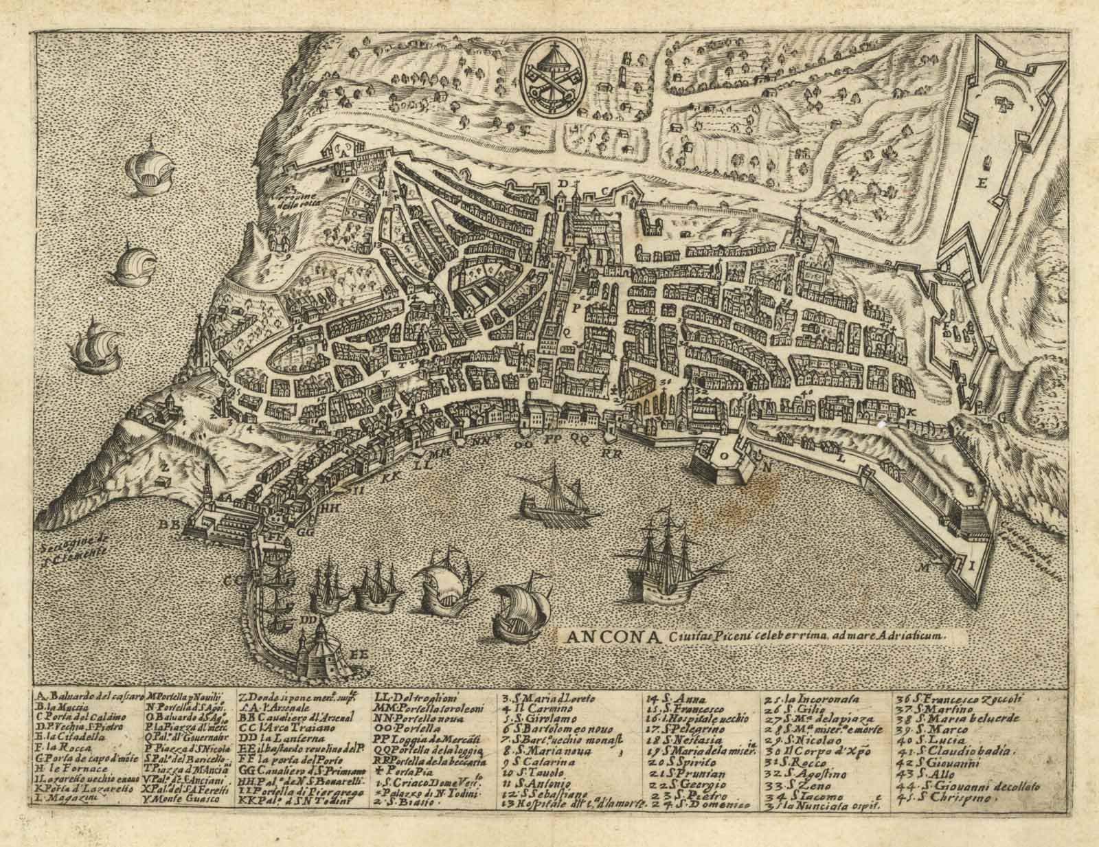 Pianta planimetrico prospettica della città di Ancona sovrastata dai simboli pontifici ad indicare l'appartenenza allo Stato Pontificio. Nella parte inferiore, per tutta la larghezza dell'incisione, rimandi alfa-numerici ai luoghi notabili suddivisi in otto colonne.