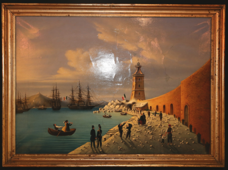 Importante documento storico, raffigurante il porto di Ancona il giorno 29 settembre 1860, il giorno in cui la città venne conquistata dalla Marina Italiana.Dipinto ad olio su carta applicato su tela, privo di firma. In basso a destra l'iscrizione "Ancona il 29 settembre 1860". L'opera raffigura il porto subito dopo la fine della battaglia, devastato dai cannoni, come dimostrano le numerose pietre sul molo. La bandiera italiana è piantata sul molo, vicino al faro, e fa bella mostra anche in uno dei vascelli. Numerose figure in uniforme sono rappresentate, tra l'altro in maniera molto accurata. Anche il disegno delle navi militari è piuttosto accurato.Ipotizziamo che il dipinto sia opera di un artista a seguito della Marina Militare, proprio per l'accuratezza del disegno die particolari. Di seguito un'accurata descrizione degli eventi realtivi:31 Agosto 1860 Golfo di NapoliGiuseppe Garibaldi ha conquistato la città, che lo ha accolto trionfalmente metre al largo incrocia la squadra navale Sarda, al comando dell'ammiraglio Carlo Pellion di Persano. La ragion di stato ferma Garibaldi, che vorrebbe subito Roma, e fa convergere le foze Sarde verso umbria e Marche. Un telegramma del ministro Cavour chiama l'ammiraglio a intervenire via mare a supporto dell'azione che i generali Fanti e Cialdini porteranno via terra. Negli stessi giorni, dal 8 al 12 settembre è anche previsto che scoppiera un movimento insurrezionale in quelle terre.Persano valuta l'impresa: comunica a Cavour che abbisogna di cannoni rigati, di completare gli equipaggi delle navi Borboni che si sono unite alla squadra e, sopratutto, non far emacare le provviste di carbone. Egli è ben conscio di non avere alcun appoggio nell'alto adriatico e, anzi, vi è la forte avversione dell'impero austroungarico.L'11 settembre la squadra lascia Napoli mentre, a nord, il generale Fanti varca i confini pontifici.con 2 corpi d'armata. Al suo comando sonoPirofregata Maria Adelaideammiraglia di Persano ad Ancona: 3484 tonn d dislocamento, costruita a i cantieri genovesi di Foce nel 1859 e con un apparato motore di ben 2255CVPirofregata Vittorio Emanuelecostruita a i cantieri genovesi di Foce nel 1856, 3126 tonn di dislocamento e 1488 CV di potenzaPirofregata Carlo Albertocostruita nei cantieri inglesi Smith di Newcastle nel 1853. 3283 tonn di dislocamento e 400 Cv di potenzaCorvetta a Ruote Costituzione costruita nei cantieri inglesi Picher Nort nel 1849. 2170 tonn di dislocamento e 400 Cv di potenzaCorvetta a Ruote Governolocostruita nei cantieri inglesi Picher Nort nel 1849. 1700 tonn di dislocamento e 450 Cv di potenzaAvviso a ruote Mozambanocostruita in inghilterra nel 1841 per la Marina Mercantile Napoletana, nel 1849 fu acquistato dalla Marina Sarda.900 tonn di dislocamento e 200 CV di potenzaInoltre si uniranno, davanti al porto dorico, la fregata San Michele, il brigantino Azzardoso e i piroscafi Tanaro e Conte di Cavour. ed il giorno 16 è in vista del promontorio del Conero. Persano manda la "costituzione" in esplorazione che riferisce la mancanza di navi da guerra. l'ammiraglio di rige per Rimini dove ha un appuntamento con il ge. fanti per coordinare la presa della città. Non riuscirà a contattarlo ne qui ne a Senigallia: il Fanti sta portando gli uomini al limite per il loro scontro piu importante:Csstelfidardo. Il giorno 18, infatti, il Fanti e il gen La Morciere si affronteranno per il destino dello stato pontificio. La vittoria arride aipiemontesi e l'esercito Pontificio si rifuggia in Ancona.Ma Persano non è uomo da attendere gli eventi e contatti l'esercito proprio a castelfidardo, riuscendo a concordare i piani per l'assedio della città. Il porto era ottimamente difeso, protetto dalla lanterna fortificata a sud e dal lazzaretto a nord, riparato dagli elementi grazie al gomito del Conero e del Guasco. Specialmente la Lanterna, casamatta armata su tre linee di fuoco e nove cannoni, donati dall'impretatore d'Austria Francesco Giuseppe a papa Pio IX e al . Importante documento storico, raffigurante il porto di Ancona il giorno 29 settembre 1860, il giorno in cui la città venne conquistata dalla Marina Italiana.Dipinto ad olio su carta applicato su tela, privo di firma. In basso a destra l'iscrizione "Ancona il 29 settembre 1860". L'opera raffigura il porto subito dopo la fine della battaglia, devastato dai cannoni, come dimostrano le numerose pietre sul molo. La bandiera italiana è piantata sul molo, vicino al faro, e fa bella mostra anche in uno dei vascelli. Numerose figure in uniforme sono rappresentate, tra l'altro in maniera molto accurata. Anche il disegno delle navi militari è piuttosto accurato.Ipotizziamo che il dipinto sia opera di un artista a seguito della Marina Militare, proprio per l'accuratezza del disegno die particolari. Di seguito un'accurata descrizione degli eventi realtivi:31 Agosto 1860 Golfo di NapoliGiuseppe Garibaldi ha conquistato la città, che lo ha accolto trionfalmente metre al largo incrocia la squadra navale Sarda, al comando dell'ammiraglio Carlo Pellion di Persano. La ragion di stato ferma Garibaldi, che vorrebbe subito Roma, e fa convergere le foze Sarde verso umbria e Marche. Un telegramma del ministro Cavour chiama l'ammiraglio a intervenire via mare a supporto dell'azione che i generali Fanti e Cialdini porteranno via terra. Negli stessi giorni, dal 8 al 12 settembre è anche previsto che scoppiera un movimento insurrezionale in quelle terre.Persano valuta l'impresa: comunica a Cavour che abbisogna di cannoni rigati, di completare gli equipaggi delle navi Borboni che si sono unite alla squadra e, sopratutto, non far emacare le provviste di carbone. Egli è ben conscio di non avere alcun appoggio nell'alto adriatico e, anzi, vi è la forte avversione dell'impero austroungarico.L'11 settembre la squadra lascia Napoli mentre, a nord, il generale Fanti varca i confini pontifici.con 2 corpi d'armata. Al suo comando sonoPirofregata Maria Adelaideammiraglia di Persano ad Ancona: 3484 to