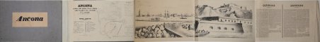 Album in quarto oblungo, contenente una spettacolare veduta panoramica della città presa dal mare, con il porto e le imbarcazioni dei pescatori in primo piano, più volte ripiegata. Una pianta della città, arricchita da una leggenda con 29 richiami ai principali monumenti ed un foglio descrittivo, in italiano e francese, completano questa rarissima opera. ' Edita ad Ancona dalla Tipografia Gionantoni, risulta sconosciuta alle bibliografie da noi consultate. ' ' Litografia, più volte ripiegata, in ottimo stato di conservazione. Album in quarto oblong, containing a beautiful panoramic view of the city from the sea, with the harbour and the fishermen ships in the foreground, folded many times. ' A city plan embellished with a 29-items legend and a descriptive sheet, both in Italian and French, complete this rare work. ' ' Printed by the typography of Gionantoni in Ancona, it is almost unknown to the main catalogues. In excellent condition. Cfr.