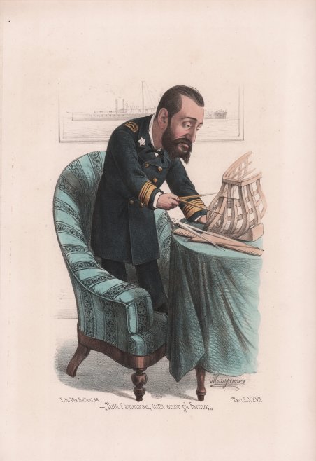 Litografia con coloritura coeva, 1877 circa, firmata in basso ' A. Manganaro. Tavola della celebre serie “Il Palazzo S. Giacomo, Album degli 80 al Municipio di Napoli 1876 e 1877” raccolta di immagini satiriche raffiguranti i rappresentanti dell’amministrazione comunale di Napoli. Vengono effigiate, pertanto, le più importanti figure comunali; giudici, avvocati, architetti, geometri, marittimi etc. sono disegnati con tratti caricaturali e associati con chiari elementi che contraddistinguono la loro professione. Nel 1877 Antonio Manganaro (Manfredonia 1842 – Napoli 1921), uno dei più celebri disegnatori satirici della Napoli della seconda metà del ‘800, dà alle stampe le tavole litografate a colori de ' Il Palazzo S. Giacomo Album degli 80 al Municipio di Napoli 1876 e 1877 ' che ritraggono con tratti caricaturali i rappresentanti dell’amministrazione comunale partenopea di quegli anni. Sul retro di ogni tavola un’ironica biografia racconta le vicende umane e professionali del personaggio raffigurato. Nella copertina dell’Album degli 80 ' ad accogliere il lettore è Ferdinando Ramognini, Delegato Straordinario (oggi si direbbe Commissario) del Municipio di Napoli, nominato dal governo il 1° maggio 1876, a seguito dello scioglimento del consiglio comunale. Di origini liguri, Ramognini (1829 – 1898) era stato uomo di fiducia di Cavour che ne aveva favorito la carriera in ambito governativo. Prima e dopo l’esperienza commissariale napoletana, terminata nel luglio del 1876, fu prefetto in varie città italiane e senatore del Regno d’Italia dal 1892 fino alla morte. L’uomo politico è ritratto da Manganaro in un elegante abito scuro su cui fa bella mostra l’onorificenza di Casa Savoia mentre apre una tenda come un sipario teatrale per mostrare l’entrata in Palazzo San Giacomo del Sindaco Gennaro Sambiase Sanseverino Duca di San Donato con la sua mole poderosa, icona inconfondibile della politica napoletana postunitaria, seguito da consiglieri. ' ' ' ' ' ' ' ' ' ' ' ' Tra le ottanta divertenti caricature dei rappresentanti comunali, tutti argutamente descritti con le proprie particolari caratteristiche fisiognomiche e con sottotitoli che in brevi motti ne sintetizzano l’occupazione o l’indole, va menzionata quella di Camillo Minieri Riccio (Napoli 1813 – ivi 1882), autore di importanti testi sulla storia della dominazione angioina e in generale del regno napoletano. Lo studioso ebbe incarichi di prestigio quali la direzione della Biblioteca di San Giacomo (1863), la nomina di rappresentante della Commissione Municipale per la conservazione dei monumenti (1869) e la direzione dell’Archivio di Stato di Napoli (1874). Nel disegno di Manganaro l’anziano consigliere, a testimonianza dei suoi precipui interessi di studio, è ritratto in una disordinata biblioteca, appollaiato sulla cima di uno scaletto, immerso nella lettura di un grosso volume circondato da altri libri poggiati sui pioli, pronti per essere consultati. ' ' ' ' ' ' ' ' ' ' ' ' Con la sua graffiante matita Manganaro, come altri celebri caricaturisti attivi in quegli anni a Napoli, quali Melchiorre de Filippis Delfico, Enrico Colonna e Mario Buonsollazzi in arte Solatium, prendendo spunto dagli avvenimenti quotidiani, mette alla berlina, ma con garbo ed eleganza, noti personaggi del mondo della politica e della cultura su Album, strenne illustrate e soprattutto giornali satirici come ' L’Arca di Noè, Il bello Gasparre .e basta così, Il Caporal terribile., ' assai diffusi all’indomani dell’Unità d’Italia. In particolare, furono ricercatissime le caricature pubblicate in ' Montecitorio Album dei 500 ' (1872-1874), nel volume ' Consiglio Provinciale di Napoli ' (1880) con gustose caricature di ministri e parlamentari e dei consiglieri provinciali e nell’Album A zonzo ' per le sale dell’Esposizione di Belle Arti di Napoli ' (1877) in cui prende in giro gli artisti del suo tempo. Lithograph with contemporary coloring, circa 1877, signed at bottom ' A. Manganaro. Plate from the famous series ““Il Palazzo S. Giacomo, Album degli 80 al Municipio di Napoli 1876 e 1877” collection of satirical images depicting representatives of the municipal administration of Naples. The most important municipal figures are portrayed; judges, lawyers, architects, surveyors, seafarers etc. are drawn with caricature features and associated with clear elements that distinguish their profession. In 1877 Antonio Manganaro (Manfredonia 1842 - Naples 1921), one of the most famous satirical draughtsmen of Naples in the second half of the 19th century, gave to the presses the color lithographed plates of ' Il Palazzo S. Giacomo Album degli 80 al Municipio di Napoli 1876 e 1877, ' which portray with caricature strokes the representatives of the Neapolitan municipal administration of those years. On the back of each plate, an ironic biography recounts the human and professional events of the person depicted. On the cover of the ' Album degli 80 ' to welcome the reader is Ferdinando Ramognini, Delegato Straordinario (today we would say Commissioner) of the Naples City Hall, appointed by the government on May 1, 1876, following the dissolution of the city council. Of Ligurian descent, Ramognini (1829 - 1898) had been a trusted man of Cavour, who favored his career in government. Before and after his Neapolitan commissarial experience, which ended in July 1876, he was prefect in several Italian cities and senator of the Kingdom of Italy from 1892 until his death. The politician is portrayed by Manganaro in an elegant dark suit on which the honorific of the House of Savoy is beautifully displayed as he opens a curtain like a theatrical curtain to show the entrance into Palazzo San Giacomo of Mayor Gennaro Sambiase Sanseverino Duca di San Donato with his mighty bulk, an unmistakable icon of post-unification Neapolitan politics, followed by councilors. ' ' ' ' ' ' ' ' ' ' ' ' Among the eighty amusing caricatures of 