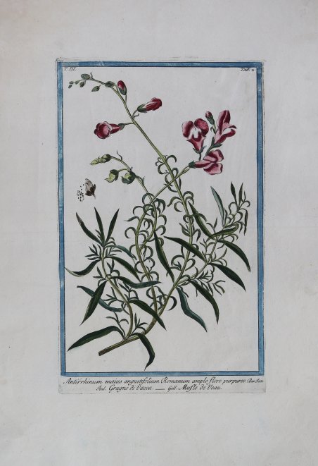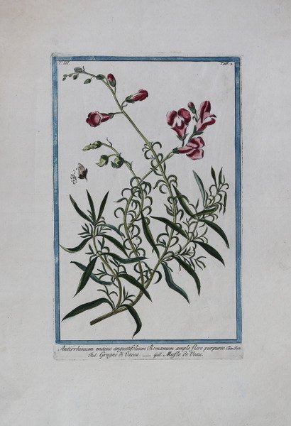 Tavola botanica tratta dal monumentale Hortus Romanus Juxta Systema Tournefortianum Paulo Strictius Distributus A Georgio Bonelli Monregalensi In Subalpinis, Publico Medicinae Professore: Specierum Nomina Suppeditante, Praestantiorum, Quas Ipse Selegit, Adumbrationem Dirigente Liberato Sabbati Maevaniensi In Umbria Chirurgicae Professore, Et Horti Custode; Adjectis Unicuique Volumini Rariorum Plantarum Tabulis C. Aere Incisis. Tom. I. (- Tom. VII.) L’opera viene stampata a Roma durante l’arco di ben 22 anni e da diversi editori: a spese di Bouchard e Gravier: Paolo Giunchi, 1772-1780-Tipografia Salomoni, 1784-Giovanni Zempel, 1793. Prima edizione di questa monumentale opera di botanica, sicuramente la più vasta e riccamente illustrata tra quelle prodotte in Italia fino ad allora. Intorno al 1770 gli editori francesi Bouchard e Gravier, avendo intenzione di dare alle stampe un catalogo illustrato dell’Orto botanico di Roma, ne proposero la direzione al medico piemontese Giorgio Bonelli (1724-1782), allora docente presso l’università romana. La cura della preparazione dei campioni per l’apparato iconografico fu invece affidata a Liberato Sabbati (1714-1778), un farmacista umbro, che era allora custode dell’Orto medesimo. Il primo volume uscì nel 1772 con una ricca introduzione del Bonelli, in cui questi fornisce un resoconto dei più recenti sviluppi della botanica e dei nuovi sistemi di classificazione e adduce poi i motivi della sua preferenza per il sistema elaborato da Joseph Pitton de Tournefort, a suo avviso più semplice e adatto all’apprendimento. Per ragioni ignote Bonelli abbandonò tuttavia l’impresa. Nel 1774, a partire dal secondo volume, essa fu presa in mano e poi condotta a termine da Niccolò Martelli (1735-1829), docente di botanica della Sapienza. Questi dette all’opera un’impostazione più linneana, pur continuando ad avvalersi della collaborazione di Liberato Sabbati fino alla sua morte, che avvenne nel 1778 al termine della pubblicazione dei primi cinque volumi. Il suo posto fu quindi preso dal figlio Costantino Sabbati. L’Hortus romanus contiene la classificazione delle varie specie di piante ospitate nell’Orto Botanico di Roma, che, stando a quanto affermato nella Horti Romani brevis historia che apre il primo volume, fu fondato a metà del Quattrocento sotto il pontificato di Niccolò V. In realtà i primi orti botanici italiani furono quelli creati a Padova e a Pisa intorno al 1545. L’Orto Romano sorse poco tempo dopo e, ampliatosi più volte, nel 1660 fu trasferito dalla sede vaticana al Gianicolo, dove ancora oggi si trova. La maggior parte delle tavole numerate non sono firmate, ma alcune sono firmate come incise da Magdalena Bouchard Il primo volume è dedicato dagli editori, Joannes Bouchard et Joannes Josephus Gravier, al Papa Clemente XIV; il secondo, al Cardinale Bernis; il terzo, al Cardinale Zelada; il quarto, al Cardinale Giraud. Il sesto volume è dedicato - dall'autore, Nicolaus Martelli - al cardinale Boncompagni. Acquaforte, finemente colorata a mano in epoca, in perfetto stato di conservazione. Bibliografia K. Nissen, ' Die botanische Buchillustration, 2 v. & suppl. (1951-1966); Great Flower Books p. 51. Hunt 629. Cleveland Botanical 509. Dunthorne 45. Pritzel 976. Nissen, BBI 200. Stafleu & Cowan TL2 634. Botanical plate from the Hortus Romanus Juxta Systema Tournefortianum Paulo Strictius Distributus A Georgio Bonelli Monregalensi In Subalpinis, Publico Medicinae Professore: Specierum Nomina Suppeditante, Praestantiorum, Quas Ipse Selegit, Adumbrationem Dirigente Liberato Sabbati Maevaniensi In Umbria Chirurgicae Professore, Et Horti Custode; Adjectis Unicuique Volumini Rariorum Plantarum Tabulis C. Aere Incisis. Tom. I. (- Tom. VII.) The work was printed in Rome over a period of 22 years and by different publishers: at the expense of Bouchard and Gravier: Paolo Giunchi, 1772-1780-Tipografia Salomoni, 1784-Giovanni Zempel, 1793. First edition of this monumental work of botany, certainly the most extensive and richly illustrated among those produced in Italy until then. Around 1770, the French editors Bouchard and Gravier, having the intention of printing an illustrated catalog of the Botanical Garden of Rome, proposed the direction to the Piedmontese doctor Giorgio Bonelli (1724-1782), then a professor at the University of Rome. The care of the preparation of samples for the iconographic apparatus was instead entrusted to Liberato Sabbati (1714-1778), an Umbrian pharmacist, who was then custodian of the Garden itself. The first volume was published in 1772 with a rich introduction by Bonelli, in which he gives an account of the most recent developments in botany and new systems of classification and then gives the reasons for his preference for the system developed by Joseph Pitton de Tournefort, in his opinion simpler and more suitable for learning. For unknown reasons Bonelli abandoned the enterprise. In 1774, starting with the second volume, it was taken over and then completed by Niccolò Martelli (1735-1829), professor of botany at the Sapienza. Martelli gave the work a more Linnean approach, while continuing to use the collaboration of Liberato Sabbati until his death in 1778 at the end of the publication of the first five volumes. His place was taken by his son Costantino Sabbati. The Hortus romanus contains the classification of the various species of plants housed in the Botanical Garden of Rome, which, according to what is stated in the Horti Romani brevis historia that opens the first volume, was founded in the mid-fifteenth century under the pontificate of Nicholas V. In reality, the first Italian botanical gardens were created in Padua and Pisa around 1545. The Roman Garden arose shortly thereafter and, expanded several times, in 1660 was transferred from the Vatican to the Janiculum, where it is still located today. Most of the numbered plates are unsigned, but a few are signed as engraved by Magdalena B