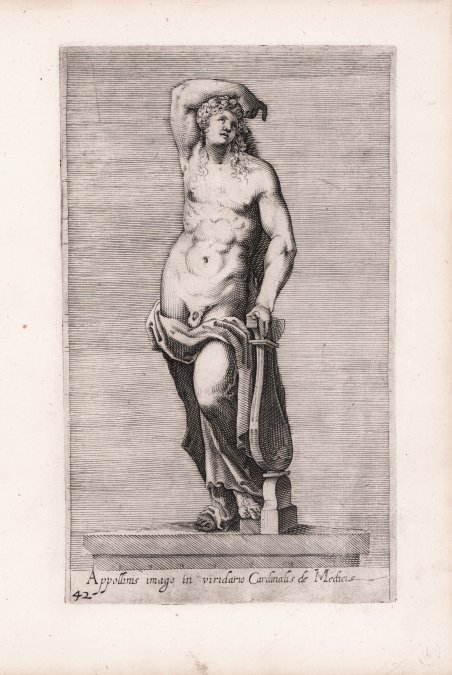 La scultura è una replica romana, datata alla metà del I secolo a. C., del cosiddetto Apollo Licio (Lykeios), creazione attribuita allo scultore tardoclassico Prassitele di Atene, operante nel IV secolo a. C. Fu trasferita a Firenze da Villa Medici a Roma insieme con le statue del gruppo dei Niobidi nel 1770. La scultura è nota anche come Apollino degli Uffizi. Opera tratta dall’Antiquarum statuarum urbis Romae…Io. Baptista de Cavalleris authore, la prima raccolta sistematica di illustrazioni di sculture antiche conservate nelle collezioni romane, che si deve all’opera dell’incisore e disegnatore Giovanni Battista Cavalieri (1525 circa - 1601) nella seconda metà del XVI secolo. Il repertorio, punto di riferimento per gli studi antiquari, conobbe grande diffusione e contribuì ad orientare l'interesse degli studiosi dell'epoca verso la statuaria antica. Il numero delle tavole, circa 50 nelle prime edizioni (databili circa al 1561/62) venne ampliato successivamente; prima del 1584 furono pubblicati i libri I e II con 100 incisioni numerate di sculture, organizzate per collezioni di appartenenza. Nel 1594 videro la luce il III e IV volume dell’opera, in cui comparvero altre 100 nuove tavole, stavolta ordinate in base all’iconografia dei soggetti. Le sculture sono raffigurate su sfondi neutri, privi di riferimenti architettonici. L’opera, con il titolo ' Antiquarum statuarum Urbis Romae primus, ' senza data, venne dedicata prima a Ottone Truchsess von Walburg – prima in qualità di diacono di S. Maria in Trastevere (1561/62) e poi di cardinale di Albano (1562/70). In seguito, con il titolo ' Antiquarum statuarum Urbis Romae primus et secundus liber ' il frontespizio reca la dedica al cardinale Ludovico Madruzzo, ed è databile al 1584/85. Nel 1594, con il titolo ' Antiquarum Statuarum Urbis Romae tertius et quartus liber, escono cento nuove tavole con dedica al cardinale G. Paluzzi degli Albertoni, del giugno 1593. Si tenga presente che, mentre nei primi due libri le statue erano pubblicate secondo le collezioni, nel terzo e quarto sono raggruppate per soggetto. La raccolta contiene, oltre alle incisioni di Giovanni Battista Cavalieri alcune tavole firmate da Cherubino Alberti, Orazio de Santis e altri famosi incisori dell’epoca. Giovanni Battista de Cavalieri o Cavalleris fu incisore, stampatore e editore. Originario di Villa Lagarina, nei pressi di Trento, risulta attivo a Venezia (dal 1559) e a Roma, dove nel 1577 apri una bottega nel quartiere Parione. Risiedeva nel vicolo di Palazzo Savelli, con uno studio vicino all’abitazione. Divenne cognato del celebre editore Lorenzo Vaccari. Realizzo lastre per Antonio Salamanca, Antonio Lafreri e Bartolomeo Faleti. Iniziò a pubblicare le sue opere intorno al 1560, ma sempre in partnership con altri: nel 1567 con Perino Zecchini e nel 1576 con Lorenzo Vaccari. Nel 1577 assunse uno stampatore, Francesco Cornuti, pubblicando opere di suoi contemporanei, tra cui Francesco Salviati, Daniele da Volterra, Raffaello, Michelangelo, Polidoro da Caravaggio, Livio Agresti e Baccio Bandinelli. ' Bulino, stampato su carta vergata coeva, in ottimo stato di conservazione. Bibliografia Thomas Ashby, ' Antiquae Statuae urbis Romae, in ' Papers of the British School at Rome, IX (1920), pp. 109-158; S. Weber, ' Artisti trentini ed artisti che operarono nel Trentino, Trento 1933, pp. 72 ss. The sculpture is a Roman replica, dated to the mid-1st century B.C.E., of the so-called Lycian Apollo (Lykeios), a creation attributed to the late-classical sculptor Praxiteles of Athens, who worked in the 4th century B.C.E. It was transferred to Florence from the Villa Medici in Rome along with the statues of the Niobid group in 1770. The sculpture is also known as Apollino of the Uffizi. Plate taken from the ' Antiquarum statuarum urbis Romae.Io. Baptista de Cavalleris authore, ' the first systematic collection of illustrations of ancient sculptures preserved in Roman collections, which is due to the work of the engraver and draftsman Giovanni Battista Cavalieri (1525 circa - 1601) in the second half of the 16th century. The repertory, a point of reference for antiquarian studies, was widely circulated and contributed to direct the interest of scholars of the time towards ancient statuary. The number of plates, about 50 in the first editions (datable to about 1561/62) was subsequently enlarged; before 1584 books I and II were published with 100 numbered engravings of sculptures, organized according to the collections they belonged to. In 1594 come to the light of the III and IV volume of the work, in which appeared other 100 new tables, this time ordered according to the iconography of the subjects. The sculptures are depicted on neutral backgrounds, without architectural references. The work, with the title ' Antiquarum statuarum Urbis Romae primus, ' undated, was first dedicated to Ottone Truchsess von Walburg - first as deacon of S. Maria in Trastevere (1561/62) and then as cardinal of Albano (1562/70). Later, with the title ' Antiquarum statuarum Urbis Romae primus et secundus liber, ' the frontispiece is dedicated to Cardinal Ludovico Madruzzo, and can be dated 1584/85. In 1594, with the title ' Antiquarum Statuarum Urbis Romae tertius et quartus liber, ' one hundred new plates were published with a dedication to Cardinal G. Paluzzi degli Albertoni, dated June 1593. Please note that, while in the first two books the statues were published according to collections, in the third and fourth are grouped by subject. The collection contains, in addition to the engravings of Giovanni Battista Cavalieri some plates signed by Cherubino Alberti, Orazio de Santis and other famous engravers of the time. Giovanni Battista de Cavalieri or Cavalleris was an engraver, printer and publisher. Born in Villa Lagarina, near Trento, is active in Venice (since 1559) and Rome, where in 1577 opened a workshop in the Parione district. He resided in the alley of Palazzo Savel