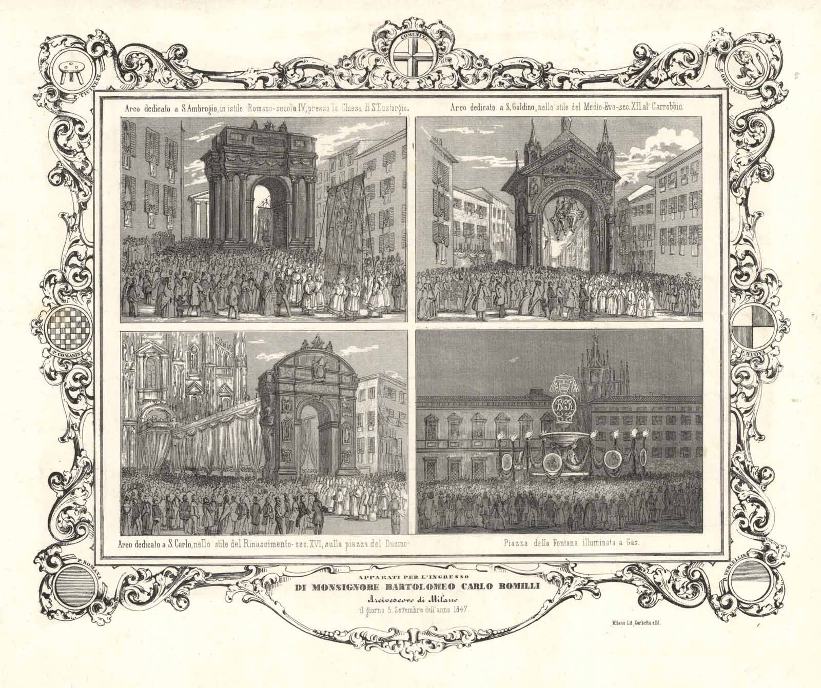 Stampa celebrativa, antica ed originale, racchiusa in decorativa cornice ornata dagli stemmi di Milano e delle sue sei Porte, raffigurante tre elementi architettonici effimeri realizzati per festeggiare l'ingresso a Milano dell'Arcivescovo Bartolomeo Romilli la sera del 5 settembre del 1847. In particolare troviamo: Arco dedicato a S. Ambrogio in stile Romano-secolo IV presso la Chiesa di S. Eustorgio, Arco dedicato a S. Galdino nello stile del Medio-Evo-sec XII al Carrobbio, l'Arco dedicato a S. Carlo nello stile del Rinascimento-sec XVI sulla Piazza del Duomo, infine veduta di Piazza Fontana illuminata a gas. La figura di Bartolomeo Romilli fu un punto di riferimento per la Milano della metà del XIX secolo, infatti rappresentava il ristabilimento della tradizione italiana del seggio vescovile ambrosiano, fattore questo, che creò un grande entusiasmo nella popolazione, come testimoniato dall'incisione stessa. Autore: Corbetta lit. Luogo: Milano. Anno: 1847. Tecnica: litografia. Dimensioni: 280x330 mm. Rif: Arrigoni 1870: vol II, 1091