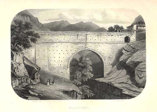 Stampa antica ed originale con veduta in primo piano dell'acquedotto. Tratta dall'opera " La Vallée d'Aoste " stampata a Parigi da Amyot. Autore: Aubert E. del. - E. Chavanne sc. Luogo: Valle d'Aosta. Anno: 1860. Tecnica: incisione in acciaio. Dimensioni: 145x215 mm