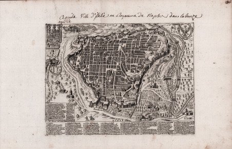 Pianta della città tratta da Heroico Splendore delle Città del Mondo, rarissima pubblicazione stampata per la prima volta a Roma nel 1639, e successivamente, ampliata con l’aggiunta di dieci nuove opere, nel 1642. In alto al centro il titolo: AQUILA. A sinistra lo stemma imperiale degli Asburgo di Spagna, a destra lo stemma araldico con l’aquila di Svevia simbolo della città. Orientazione nei quattro lati al centro con i punti cardinali SEPTENTRIO, MEZODI, LEVANTE, PONENTE, il nord a sinistra. Lungo il bordo inferiore e nel riquadro a sinistra disposta su dieci colonne una legenda numerica di 91 rimandi a luoghi cose e monumenti notabili. Giacomo Lauro, fu incisore, stampatore e conoscitore di antichità attivo prevalentemente in ambito romano tra il 1583 e il 1645. Non si conosce la data e il luogo di nascita, ma il fatto che egli firmasse le sue opere come "Jacobus Laurus Romanus" lascia presumere che fosse originario di Roma. Nulla si conosce della sua formazione. La prima testimonianza documentaria che attesta la sua presenza a Roma, in cui è definito "intagliatore di rame romano", risale al 1583; mentre la sua prima stampa conosciuta è un Tiberio con la daga (o Il gladiatore), pubblicata da Claudio Duchetti nel 1585. Nonostante abbia affrontato tematiche storiche, mitologiche, devozionali, il Lauro è noto soprattutto per la produzione di piante e vedute di città, a cominciare dalla veduta a volo d'uccello di Rocca Contrada (Arcevia), realizzata nel 1594 per Angelo Rocca su disegno di Ercole Ramazzani. Negli anni 1630-45, Lauro si dedicò alla pubblicazione di una serie di piante e descrizioni di città italiane e straniere in forma di piccoli opuscoli, alcuni dei quali furono raccolti nel 1639 sotto il titolo di Heroico splendore delle città del mondo. Le piante di Lauro, dunque, furono il frutto di un lungo lavoro di ricerca, basato su fonti primarie, e pubblicato per la prima volta in libri o opuscoli con testo relativo alla storia della città. Scrive Thomas Ashby: “Negli anni 1630-1645 il Lauro pubblicò un numero rilevante di descrizioni di città in tanti opuscoli col testo, tutti in folio piccolo oblungo. Le piante non sono tutte originali […] Molte volte sono state adoperate come fonti, s’intende, le belle tavole dell’atlante del Lafrèry. Ma anche altre piante sono state messe sotto contributo - molto è stato preso o dall’opera di Braun e Hogenberg, Civitales Orbis Terrarum, oppure anche in questo caso da fonti comuni. Non mancano i contatti con Matteo Florimi di Siena, il quale in nessun caso compì di opera propria, ma copiò sempre i lavori degli altri. La pianta di Viterbo, finalmente, è derivata dalla pianta di Tarquinio Ligustri di Viterbo, fatta nel 1596 e dedicata al Cardinale Odoardo Farnese, Alcune di queste piante furono raccolte sotto il titolo seguente, inciso nel 1639; HEROICO SPLENDORE DELLE CITTA DEL MONDO LIBRO PRIMO DI IACOMO LAURO ROMANO Dove si uedono le piante di molte Citta Ill.ri e di molte non più state alla stampa con le loro origini et atti segnalati, et quanto si estende il dominio di esse sino alli presenti tempi in Roma l’Anno di nostra salute 1639” (cfr. Thomas Ashby, L'Heroico splendore delle città del mondo, in “La Bibliofilia”, XXXI (1929), pp. 105-122). L’opera venne ristampata nel 1642 con imprint in Roma l’Anno di nostra salute 1642 /Con priuilegio del somo Pontefice, et d'altri Potent.ti Con licenza de Superiori. Sebbene nel frontespizio si parli di “Libro primo” un secondo volume della raccolta non venne mia pubblicato. Incisione in rame, stampata su carta vergata coeva, con margini, leggerissime ossidazioni, per il resto in ottimo stato di conservazione. Rarissima. Bibliografia Ashby (1929): p. 116, n. 22 e p. 119, n. 14; Cremonini (1991): pp. 37-38, n. 7; Ganado (1994): p. 168, n. 22; ' Thomas Ashby, Un incisore antiquario del Seicento, I, Note intorno alla vita ed opere di Giacomo Lauro, in “La Bibliofilia”, XX. Map of the city taken from ' Heroico Splendore delle Città del Mondo, ' a very rare publication printed for the first time in Rome in 1639, and later, expanded with the addition of ten new works, in 1642. Giacomo Lauro, was an engraver, printer and connoisseur of antiquities active mainly in Rome between 1583 and 1645. We do not know the date and place of birth, but the fact that he signed his works as "Jacobus Laurus Romanus" suggests that he was a native of Rome. Nothing is known about his education. The first documentary evidence of his presence in Rome, in which he is defined as a "Roman copper engraver", dates back to 1583; while his first known print is a ' Tiberius with a dagger ' (or ' The Gladiator), published by Claudio Duchetti in 1585. Although he dealt with historical, mythological, devotional themes, Lauro is mainly known for the production of plans and views of cities, starting with the bird's eye view of Rocca Contrada (Arcevia), made in 1594 for Angelo Rocca on a drawing by Ercole Ramazzani. In the years 1630-45, Lauro dedicated himself to the publication of a series of maps and descriptions of Italian and foreign cities in the form of small pamphlets, some of which were collected in 1639 under the title of ' Heroico Splendore delle Città del Mondo. Lauro's plans, therefore, were the result of a long research work, based on primary sources, and published for the first time in books or pamphlets with text related to the history of the city. Thomas Ashby writes: "In the years 1630-1645 the Lauro published a considerable number of descriptions of cities in many pamphlets with text, all in small oblong folio. The plants are not all original [.] Many times have been used as sources, of course, the beautiful plates of the Atlas of Lafrèry. But other maps were also contributed - much was taken either from the work of Braun and Hogenberg, ' Civitales Orbis Terrarum, or even in this case from common sources. There is no lack of contact with Matteo Florimi of Siena, who 