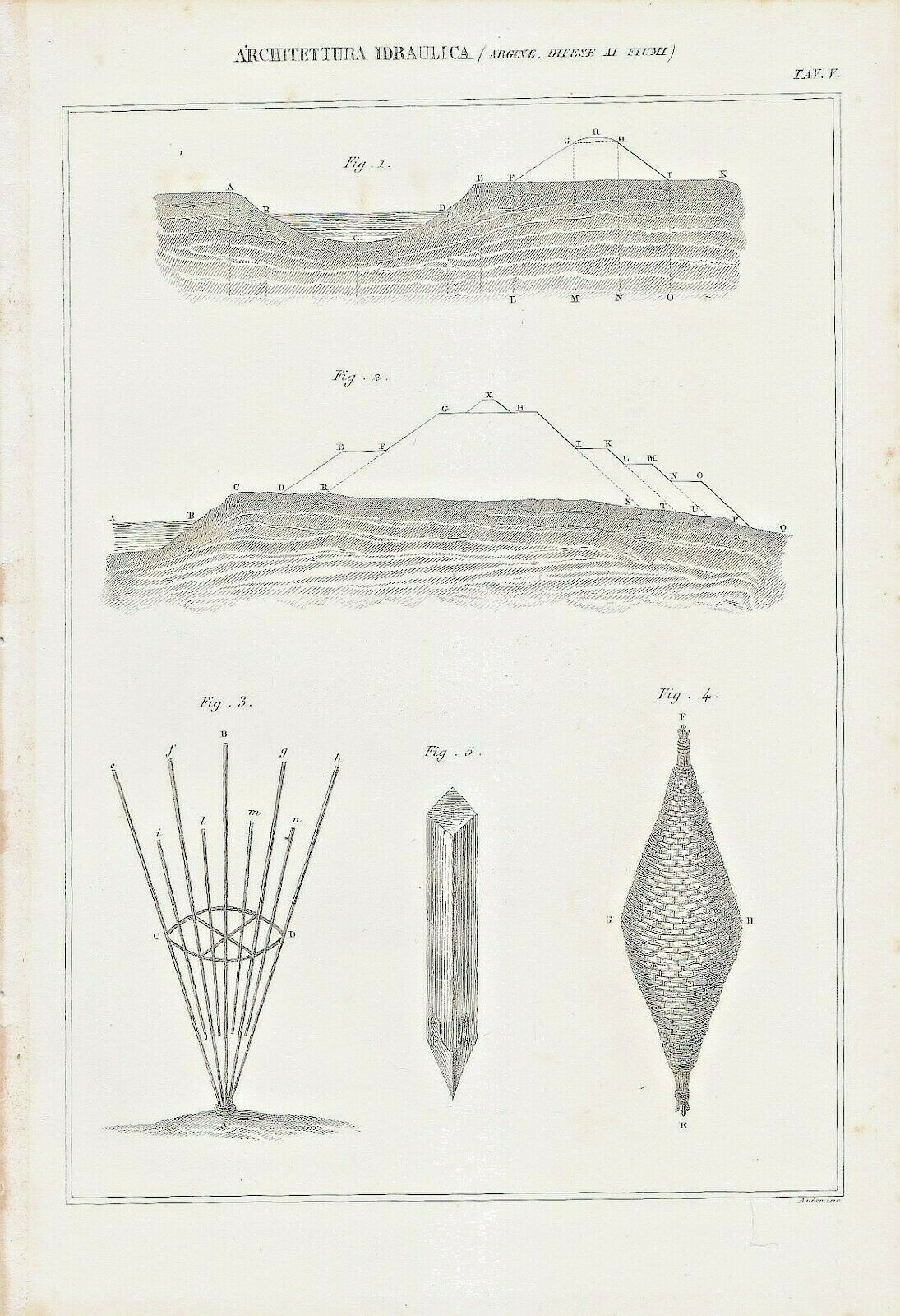 ARCHITETTURA IDRAULICA ARGINE DIFESE FIUMI Incisione Stampa Antica 1866 TAVOLA