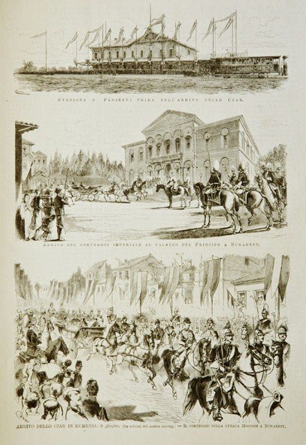 Arrivo del Czar in Rumenia: 6 giugno / Stazione di Plojesti prima dell’arrivo dello Czar.- Arrivo del corteggio imperiale al palazzo del Principe a Bukarest.- Il corteggio sulla strada Mogosoi a Bukarest