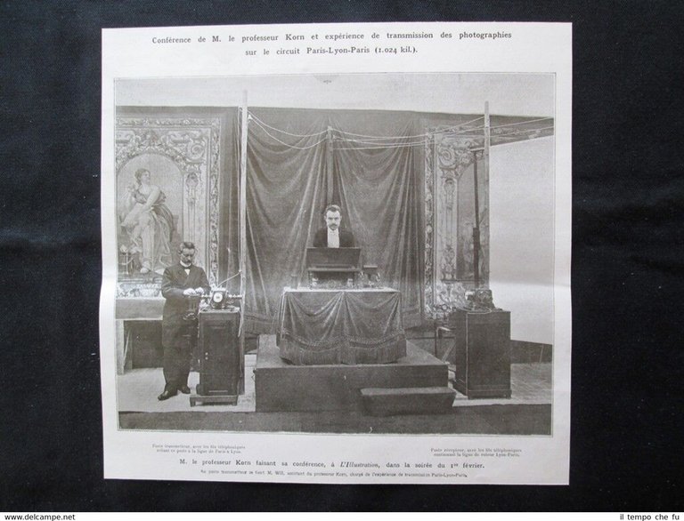Rara stampa estratta da pubblicazione del 1907 .stampa che ha quindi oltre 111 anni! Conferenza del professor Korn e esperienza della trasmissione delle fotografie sul circuito Parigi-Lione-Parigi (1024 chilometri) Il Professor Arthur Korn tiene la sua conferenza, nella serata del 1 febbraio 1907 Dimensioni Cm 23,00 x 23,00 Illustration 1907 - 018 Qualora vogliate delle scansioni migliori contattateci, soddisferemo ogni vostra richiesta. Paypal Carta di credito Bonifico bancario Accuratamente adagiate su un cartoncino e protette da pellicola trasparente rigida, il tutto viene inserito dentro plico di adeguate dimensioni per proteggerne l'integrità.